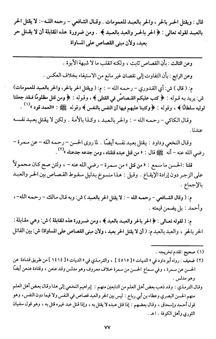 قال: ويقتل الحر بالحر، والحر بالعبد للعمومات. وقال الشافعي - رَحِمَهُ اللَّهُ -: لا يقتل الحر بالعبد لِقَوْلِهِ تَعَالَى: {الْحُرُّ بِالْحُرِّ وَالْعَبْدُ بِالْعَبْدِ} [البقرة: 178] . ومن ضرورة هذه المقابلة أن لا يقتل حر بعبد؛ ولأن مبنى القصاص على المساواة،