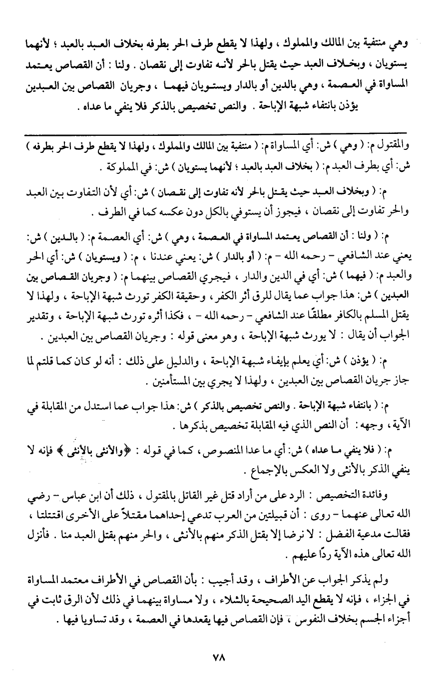 وهي منتفية بين المالك والمملوك، ولهذا لا يقطع طرف الحر بطرفه بخلاف العبد بالعبد؛ لأنهما يستويان، وبخلاف العبد حيث يقتل بالحر لأنه تفاوت إلى نقصان. ولنا: أن القصاص يعتمد المساواة في العصمة، وهي بالدين أو بالدار ويستويان فيهما، وجريان القصاص بين العبدين يؤذن بانتفاء شبهة الإباحة. والنص تخصيص بالذكر فلا ينفي ما عداه.
