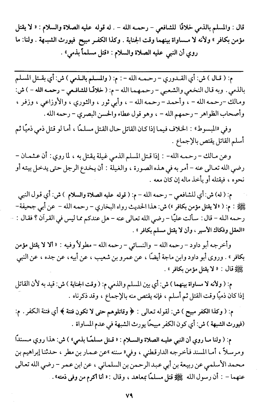 م: (قال) ش: أي القدوري - رَحِمَهُ اللَّهُ -: م: (والمسلم بالذمي) ش: أي بقتل المسلم بالذمي. وبه قال النخعي والشعبي - رحمهما الله - م: (خلافا للشافعي - رَحِمَهُ اللَّهُ -) ش: ومالك - رَحِمَهُ اللَّهُ -، وأحمد - رَحِمَهُ اللَّهُ -، وأبي ثور، والثوري، والأوزاعي، وزفر، وأصحاب الظواهر - رَحِمَهُمُ اللَّهُ -، وهو قول عطاء والحسن البصري - رَحِمَهُ اللَّهُ -.