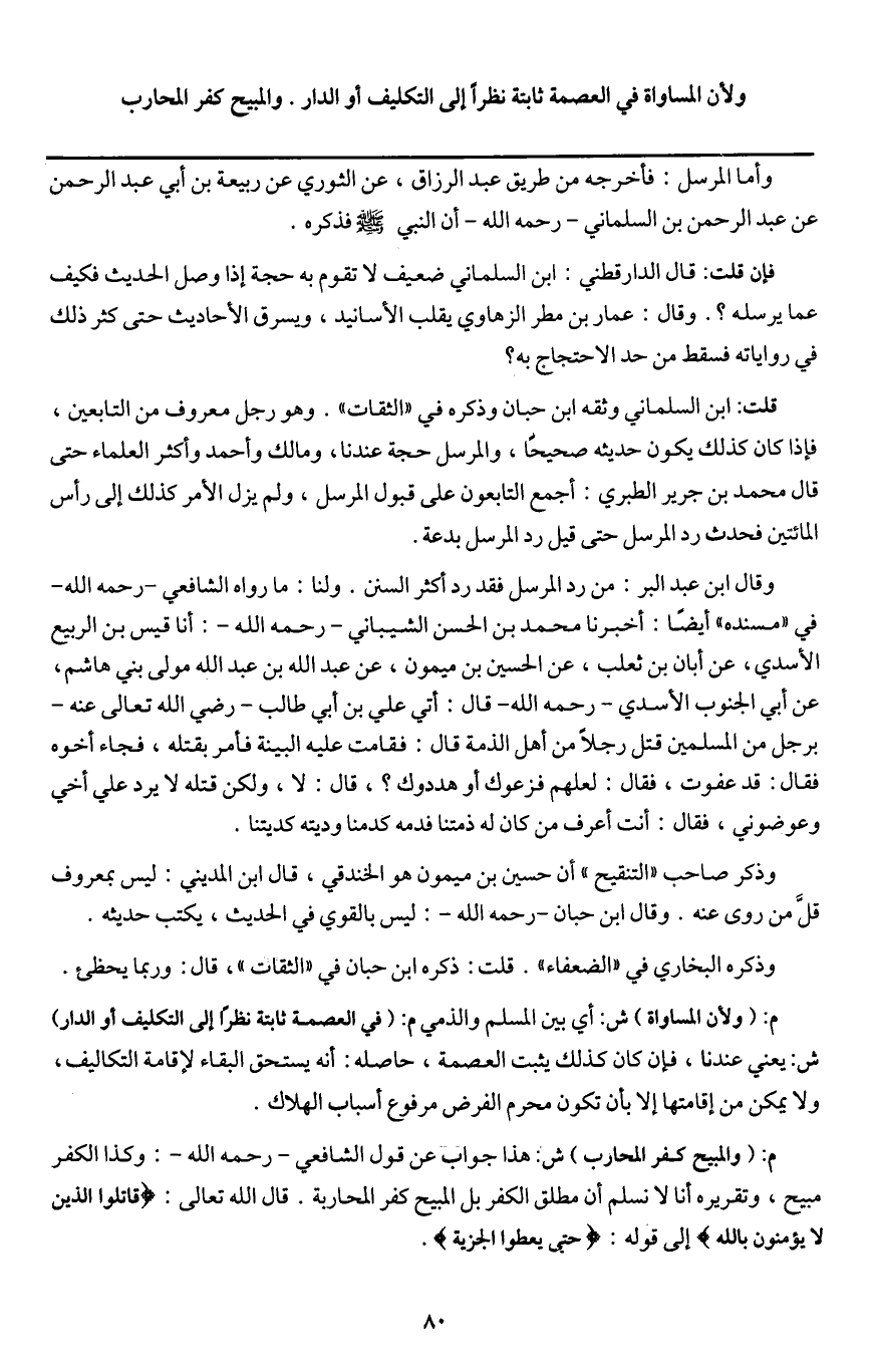 ولأن المساواة في العصمة ثابتة نظرا إلى التكليف أو الدار. والمبيح كفر المحارب