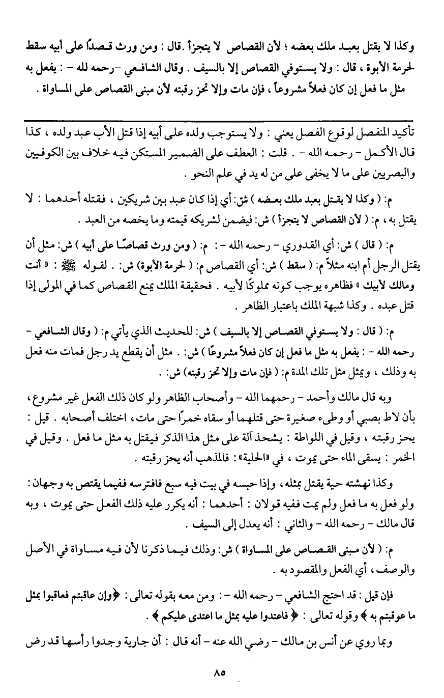 وكذا لايقتل بعبد ملك بعضه، لأن القصاص لا يتجزأ. قال: ومن ورث قصدا على أبيه سقط لحرمة الأبوة