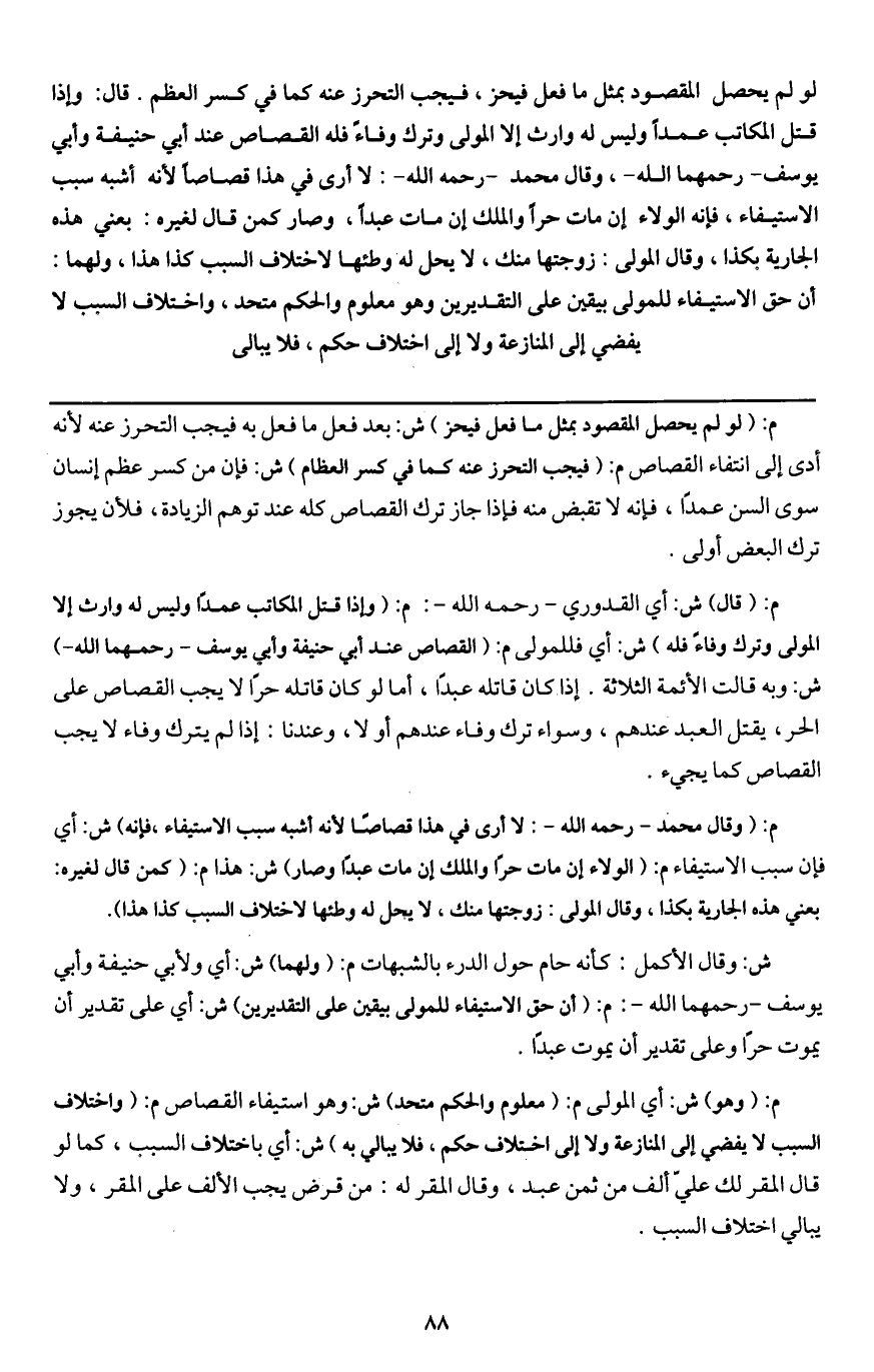 م: (وقال محمد - رَحِمَهُ اللَّهُ -: لا أرى في هذا قصاصا لأنه أشبه سبب الاستيفاء، فإنه) ش: أي فإن سبب الاستيفاء م: (الولاء إن مات حرا والملك إن مات عبدا وصار) ش: هذا م: (كمن قال لغيره: بعني هذه الجارية بكذا، وقال المولى: زوجتها منك، لا يحل له وطئها لاختلاف السبب كذا هذا) .
