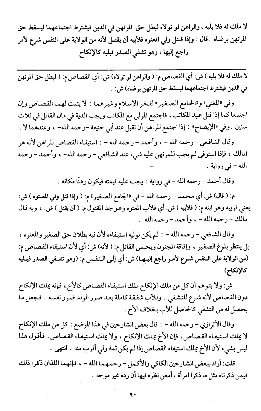 لا ملك له فلا يليه، والراهن لو تولاه لبطل حق المرتهن في الدين فيشترط اجتماعهما ليسقط حق المرتهن برضاه. قال: وإذا قتل ولي المعتوه فلأبيه أن يقتل لأنه من الولاية على النفس شرع لأمر راجع إليها، وهو تشفي الصدر فيليه كالإنكاح