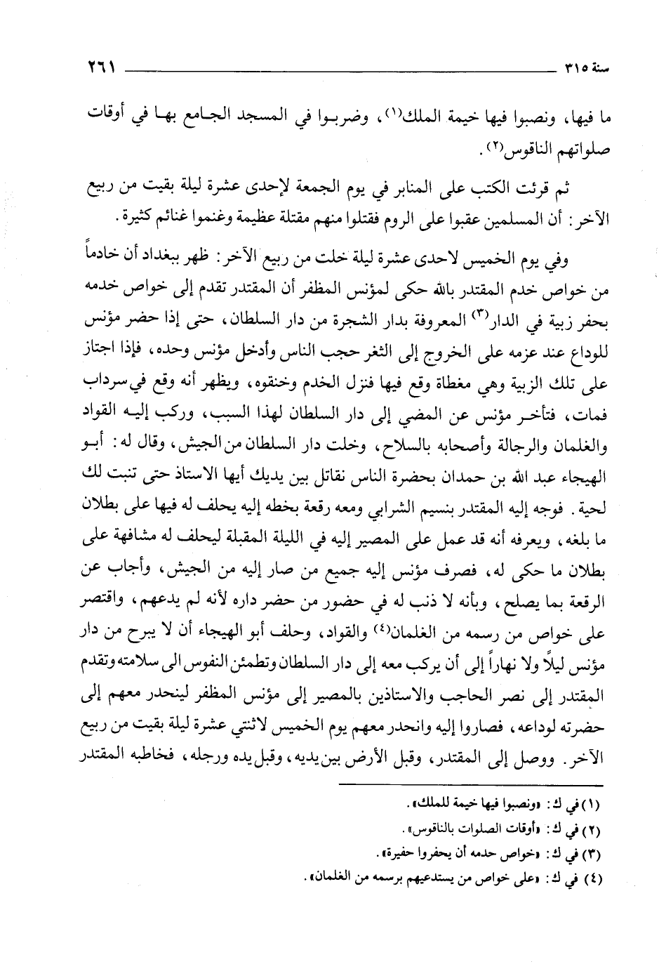 وفى يوم الخميس لإحدى عشرة ليلة خلت من ربيع الآخر: ظهر ببغداد أن خادما من خواص خدم المقتدر باللَّه حكى لمؤنس المظفر أن المقتدر تقدم إلى خواص خدمه بحفر زبية في الدار [3] المعروفة بدار الشجرة من دار السلطان، حتى إذا حضر مؤنس للوداع عند عزمه على الخروج إلى الثغر حجب الناس وأدخل مؤنس وحده، فإذا اجتاز على تلك الزبية وهي مغطاة وقع فيها فنزل الخدم وخنقوه، ويظهر أنه وقع في سرداب فمات، فتأخر مؤنس عن المضي إلى دار السلطان لهذا السبب، وركب إليه القواد والغلمان والرجالة وأصحابه بالسلاح، وخلت دار السلطان من الجيش، وَقَالَ له: أَبُو الهيجاء عبد الله بْن حمدان بحضرة الناس نقاتل بين يديك أيها الأستاذ حتى تنبت لك لحية. فوجه إليه المقتدر بنسيم الشرابي ومعه رقعة بخطه إليه يحلف له فيها على بطلان ما بلغه، ويعرفه أنه قد عمل على المصير إليه في الليلة المقبلة ليحلف له مشافهة على بطلان ما حكي له، فصرف مؤنس إليه جميع من صار إليه من الجيش، وأجاب عن الرقعة بما يصلح، وبأنه لا ذنب له في حضور من حضر داره لأنه لم يدعهم، واقتصر على خواص من رسمه من الغلمان [4] والقواد، وحلف أبو الهيجاء أن لا يبرح من دار مؤنس ليلا ولا نهارا إلى أن يركب معه إلى دار السلطان وتطمئن النفوس إلى سلامته وتقدم المقتدر إلى نصر الحاجب والأستاذين بالمصير إلى مؤنس المظفر لينحدر معهم إلى حضرته لوداعه، فصاروا إليه وانحدر معهم يوم الخميس لاثنتي عشرة ليلة بقيت من ربيع الآخر. ووصل إلى المقتدر، وقبل الأرض بين يديه، وقبل يده ورجله، فخاطبه المقتدر