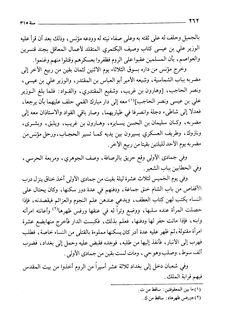 بالجميل وحلف له على ثقته به وعلى صفاء نيته له وودعه مؤنس، وذلك بعد أن قرأ عليه الوزير عَلي بْن عيسى كتاب وصيف البكتمري المتقلد لأعمال المعاقل بجند قنسرين والعواصم، بأن المسلمين عقبوا على الروم فظفروا بعسكرهم وقتلوا منهم وغنموا.