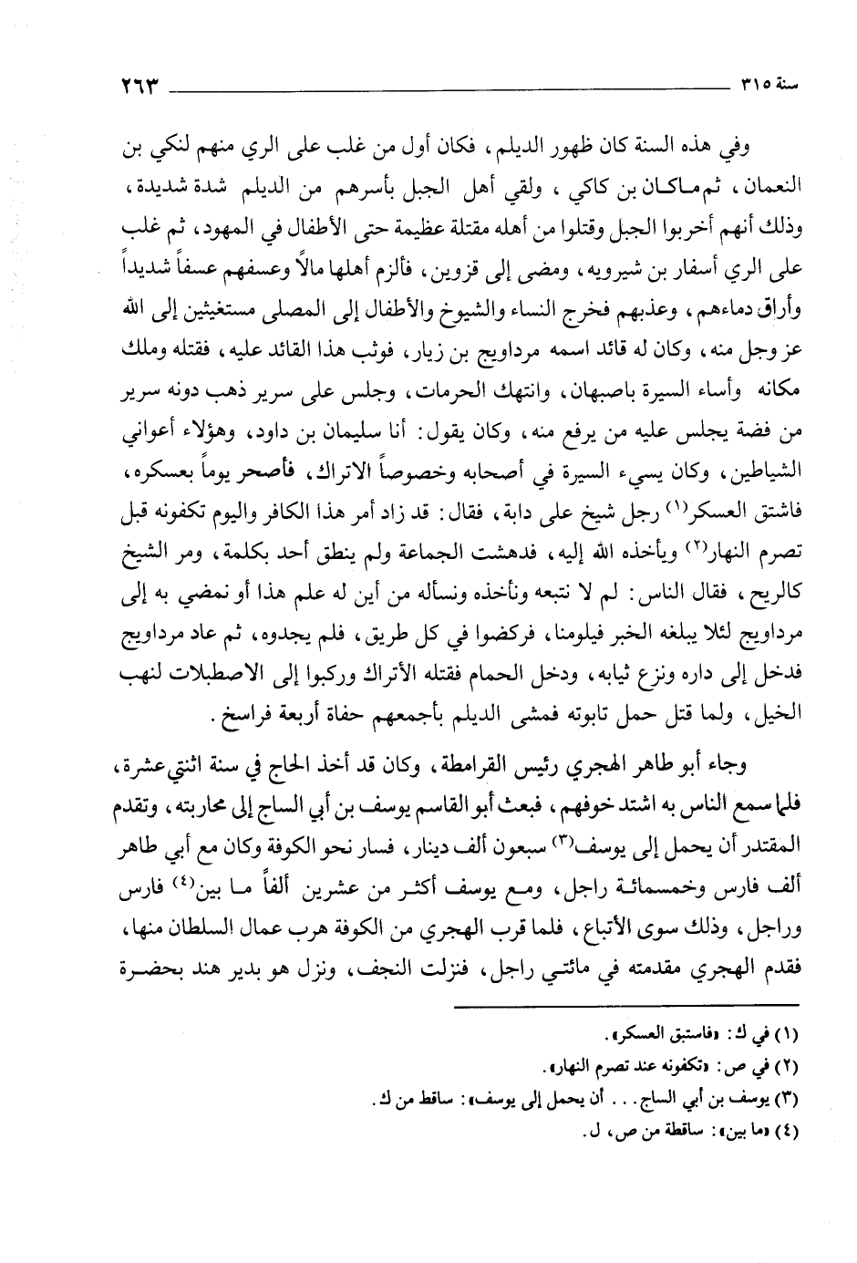 وفى هذه السنة كَانَ ظهور الديلم، فكان أول من غلب على الري منهم لنكى بن النعمان، ثم ما كان بْن كاكي، ولقي أهل الجبل بأسرهم من الديلم شدة شديدة، وذلك أنهم أخربوا الجبل وقتلوا من أهله مقتلة عظيمة حتى الأطفال في المهود، ثم غلب على الري أسفار بْن شيرويه، ومضى إلى قزوين، فألزم أهلها مالا وعسفهم عسفا شديدا وأراق دماءهم، وعذبهم فخرج النساء والشيوخ والأطفال إلى المصلى مستغيثين إلى الله عز وجل منه، وَكَانَ له قائد اسمه مرداويج بْن زيار، فوثب هذا القائد عليه، فقتله وملك مكانه وأساء السيرة بأصبهان، وانتهك الحرمات، وجلس على سرير ذهب دونه سرير من فضة يجلس عليه من يرفع منه، وَكَانَ يقول: أنا سليمان بْن داود، وهؤلاء أعواني الشياطين، وَكَانَ يسيء السيرة في أصحابه وخصوصا الأتراك، فأصحر يوما بعسكره، فاشتق العسكر [1] رجل شيخ على دابة، فَقَالَ: قد زاد أمر هذا الكافر واليوم تكفونه قبل تصرم النهار [2] ويأخذه الله إليه، فدهشت الجماعة ولم ينطق أحد بكلمة، ومر الشيخ كالريح، فَقَالَ الناس: لم لا نتبعه ونأخذه ونسأله من أين له علم هذا أو نمضي به إلى مرداويج لئلا يبلغه الخبر فيلومنا، فركضوا في كل طريق، فلم يجدوه، ثم عاد مرداويج فدخل إلى داره ونزع ثيابه، ودخل الحمام فقتله الأتراك وركبوا إلى الاصطبلات لنهب الخيل، ولما قتل حمل تابوته فمشى الديلم بأجمعهم حفاة أربعة فراسخ.