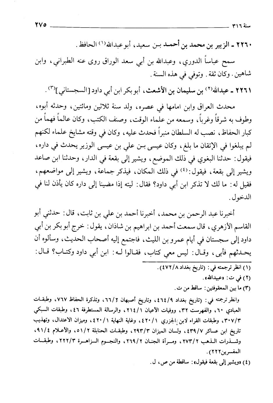 محدث العراق وابن إمامها في عصره، ولد سنة ثلاثين ومائتين، وحدثه أبوه، وطوف به شرقا وغربا، وسمعه من علماء الوقت، وصنف الكتب، وَكَانَ عالما فهما من كبار الحفاظ، نصب له السلطان منبرا فحدث عليه، وَكَانَ في وقته مشايخ علماء لكنهم لم يبلغوا في الإتقان ما بلغ، وَكَانَ عيسى بْن عَلي بْن عيسى الوزير يحدث في داره، فيقول: حَدَّثَنَا البغوي في ذلك الموضع، ويشير إلى بقعة في الدار، وحدثنا ابن صاعد ويشير إلى بقعة، فيقول: [4] في ذلك المكان، فيذكر جماعة، ويشير إلى مواضعهم، فقيل له: ما لك لا تذكر ابن أبي داود؟ فَقَالَ: ليته إذا مضينا إلى داره كَانَ يأذن لنا في الدخول.