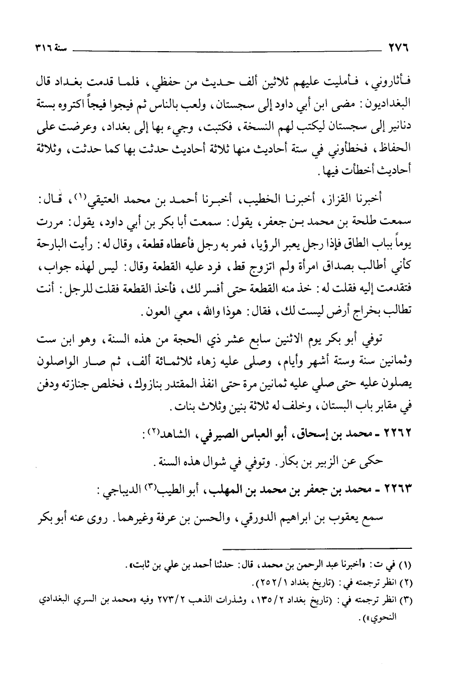 [3] انظر ترجمته في: (تاريخ بغداد 2/ 135، وشذرات الذهب 2/ 273 وفيه «محمد بن السري البغدادي النحويّ» ) .