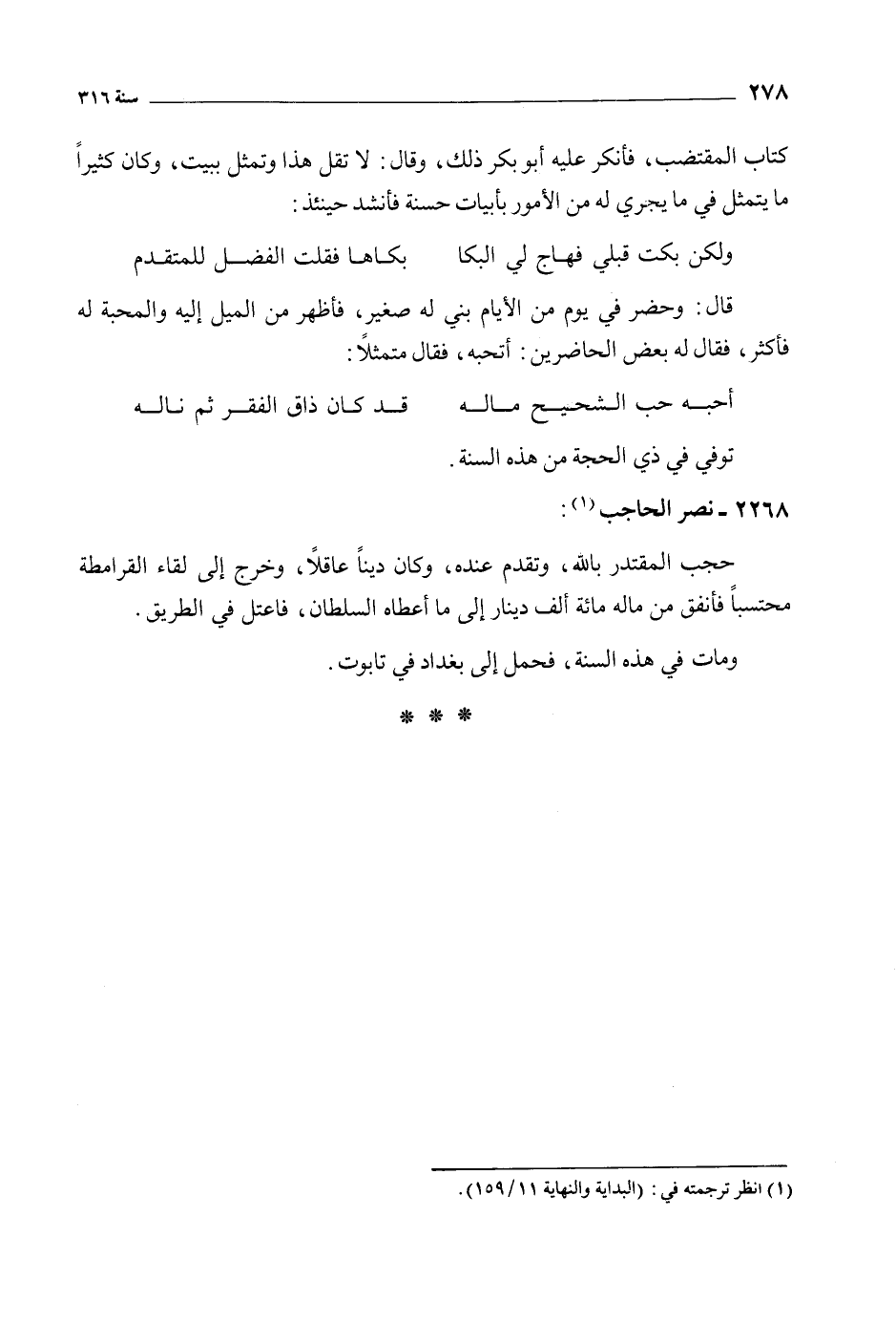 حجب المقتدر باللَّه، وتقدم عنده، وَكَانَ دينا عاقلا، وخرج إلى لقاء القرامطة محتسبا فأنفق من مالة مائة ألف دينار إلى ما أعطاه السلطان، فاعتل في الطريق.