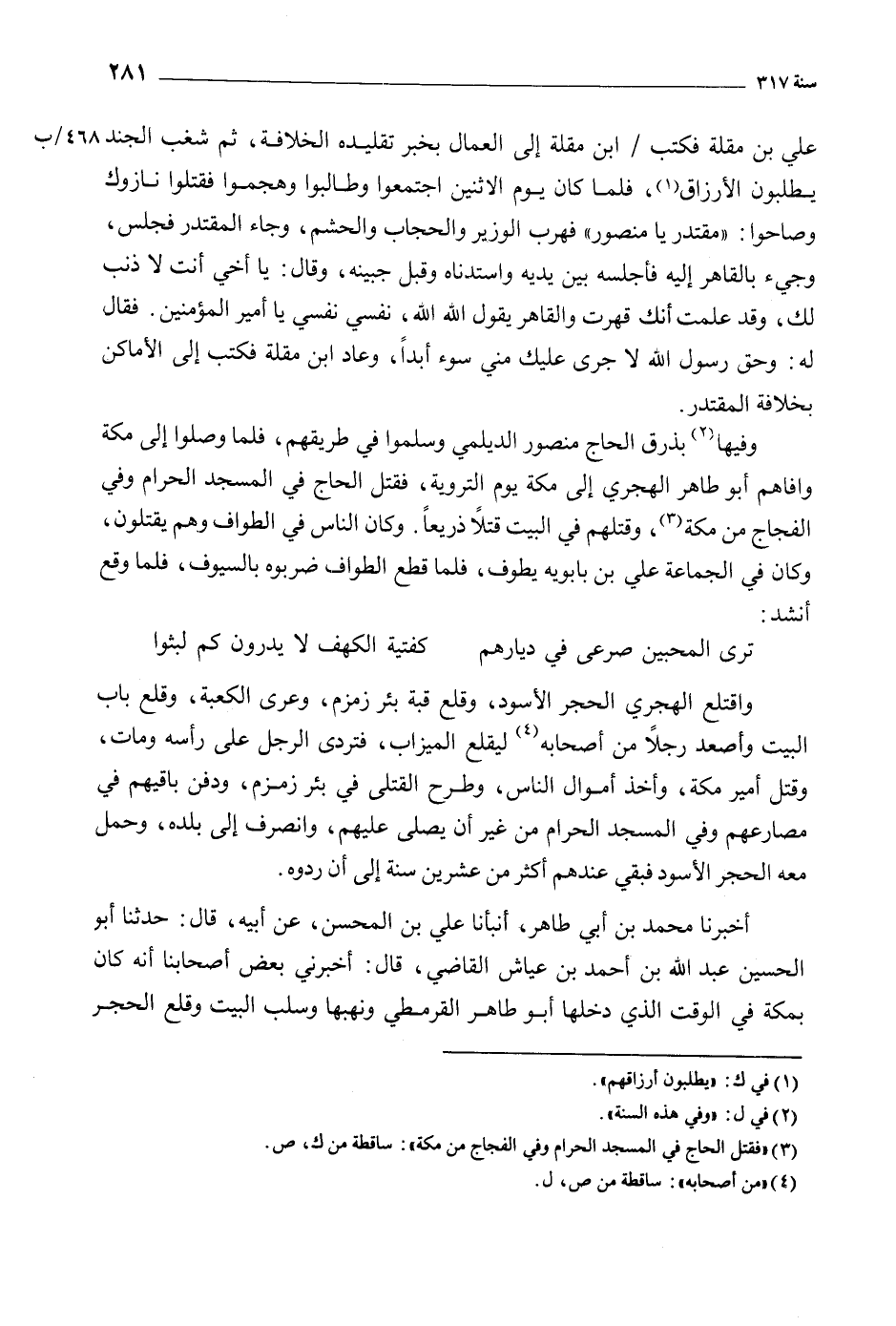 وفيها [2] بذرق الحاج منصور الديلمي وسلموا في طريقهم، فلما وصلوا إلى مكة وافاهم أَبُو طاهر الهجري إلى مكة يوم التروية، فقتل الحاج في المسجد الحرام وفى الفجاج من مكة [3] ، وقتلهم في البيت قتلا ذريعا. وَكَانَ الناس في الطواف وهم يقتلون، وَكَانَ في الجماعة عَلي بْن بابويه يطوف، فلما قطع الطواف ضربوه بالسيوف، فلما وقع أنشد: