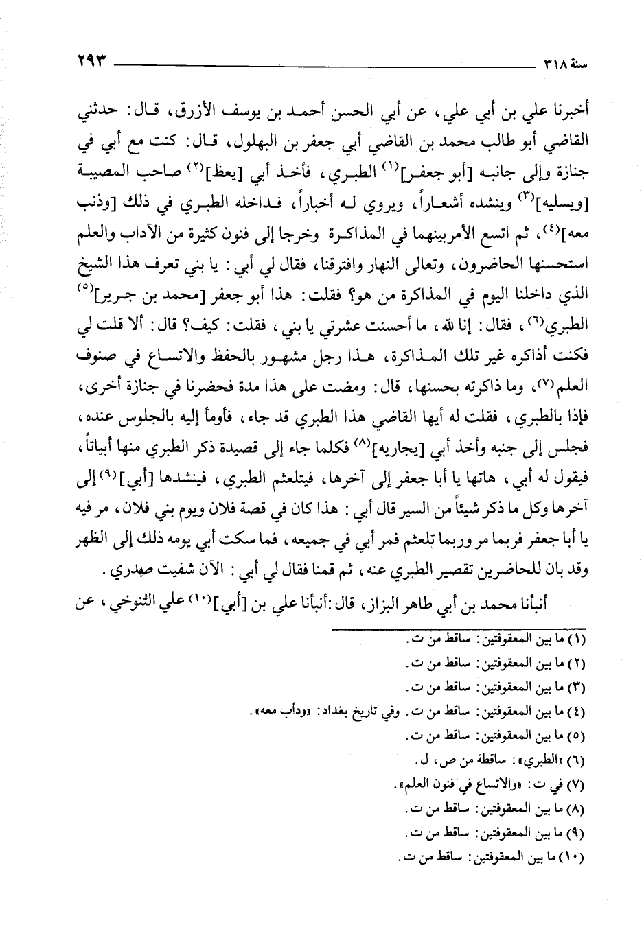 أخبرنا علي بن أبي علي، عن أبي الحسن أَحْمَد بْن يُوسُف الأزرق، قَالَ: حدثني القاضي أَبُو طالب مُحَمَّد بْن القاضي أبي جعفر بْن البهلول، قَالَ: كنت مع أبي في جنازة وإلى جانبه [أَبُو جعفر] [1] الطبري، فأخذ أبي [يعظ] [2] صاحب المصيبة [ويسليه] [3] وينشده أشعارا، ويروي له أخبارا، فداخله الطبري في ذلك [وذنب معه] [4] ، ثم اتسع الأمر بينهما في المذاكرة وخرجا إلى فنون كثيرة من الآداب والعلم استحسنها الحاضرون، وتعالى النهار وافترقنا، فقال لي أبي: يا بني تعرف هذا الشيخ الّذي داخلنا اليوم في المذاكرة من هو؟ فقلت: هذا أبو جعفر [محمد بن جرير] [5] الطبري [6] ، فقال: إنا للَّه، ما أحسنت عشرتي يا بني، فقلت: كيف؟ قَالَ: ألا قلت لي فكنت أذاكره غير تلك المذاكرة، هذا رجل مشهور بالحفظ والاتساع في صنوف العلم [7] ، وما ذاكرته بحسنها، قَالَ: ومضت على هذا مدة فحضرنا في جنازة أخرى، فإذا بالطبري، فقلت له أيها القاضي هذا الطبري قد جاء، فأومأ إليه بالجلوس عنده، فجلس إلى جنبه وأخذ أبي [يجاريه] [8] فكلما جاء إلى قصيدة ذكر الطبري منها أبياتا، فيقول له أبي، هاتها يا أبا جعفر إلى آخرها، فيتلعثم الطبري، فينشدها [أبي] [9] إلى آخرها وكل ما ذكر شيئا من السير قَالَ أبي: هذا كَانَ في قصة فلان ويوم بني فلان، مر فيه يا أبا جعفر فربما مر وربما تلعثم فمر أبي في جميعه، فما سكت أبي يومه ذلك إلى الظهر وقد بان للحاضرين تقصير الطبري عنه، ثم قمنا فقال لي أبي: الآن شفيت صدري.