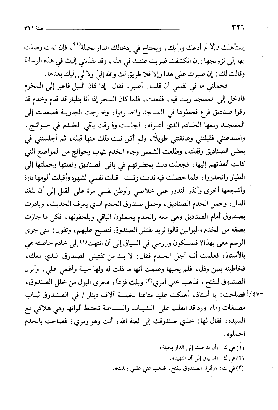 يستأهلك وإلا لم أدعك ورأيك، ويحتاج في إدخالك الدار بحيلة [1] ، فإن تمت وصلت بها إلى تزويجها وإن انكشفت ضربت عنقك في هذا، وقد نفذتني إليك في هذه الرسالة وقالت لك: إن صبرت على هذا وإلا فلا طريق لك والله إلي ولا لي إليك بعدها.