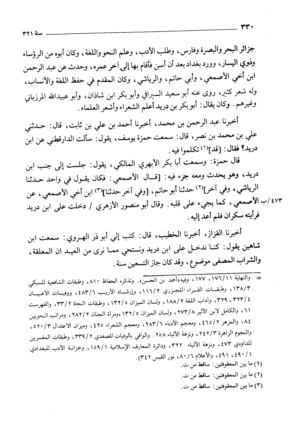 قَالَ حمزة: وسمعت أبا بكر الأبهري المالكي، يقول: جلست إلى جنب ابن دريد، وهو يحدث ومعه جزء فيه: [قَالَ الأصمعي: فكان يقول في واحد حَدَّثَنَا الرياشي، وفى آخر] [2] حَدَّثَنَا أَبُو حاتم، [وفى آخر حَدَّثَنَا] [3] ابن أخي الأصمعي، عَنِ الأصمعي، كما يجيء على قلبه. وَقَالَ أَبُو منصور الأزهري/ دخلت على ابن دريد فرأيته سكران فلم أعد إليه.