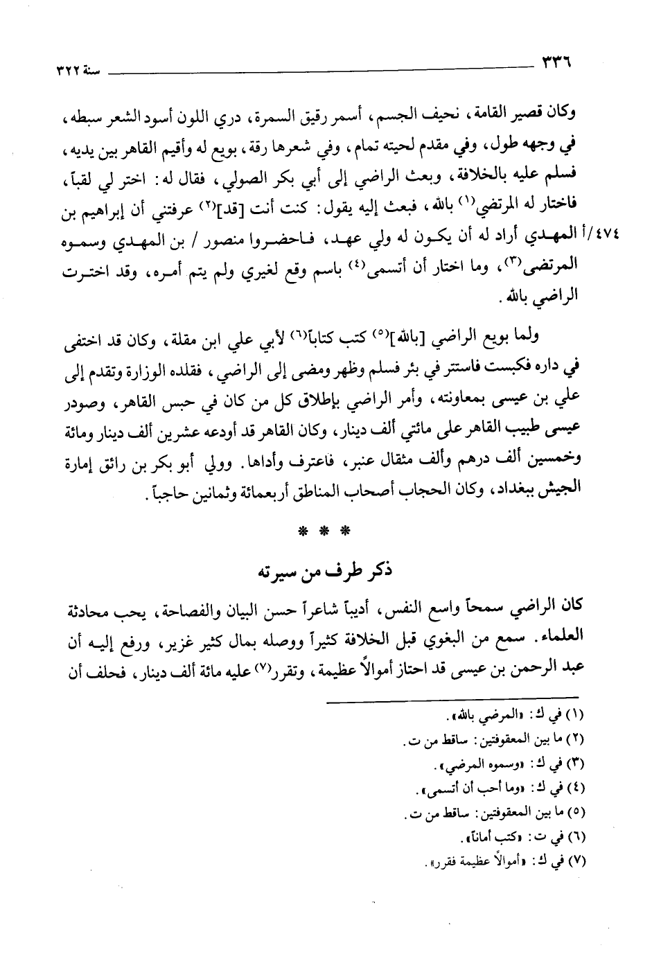ولما بويع الراضي [باللَّه] [5] كتب كتابا [6] لأبي علي ابن مقلة، وَكَانَ قد اختفى في داره فكبست فاستتر في بئر فسلم وظهر ومضى إلى الراضي، فقلده الوزارة وتقدم إلى عَلي بْن عيسى بمعاونته، وأمر الراضي بإطلاق كل من كَانَ في حبس القاهر، وصودر عيسى طبيب القاهر على مائتي ألف دينار، وَكَانَ القاهر قد أودعه عشرين ألف دينار ومائة وخمسين ألف درهم وألف مثقال عنبر، فاعترف وأداها. وولي أَبُو بكر بْن رائق إمارة الجيش ببغداد، وكان الحجاب أصحاب المناطق أربعمائة وثمانين حاجبا.