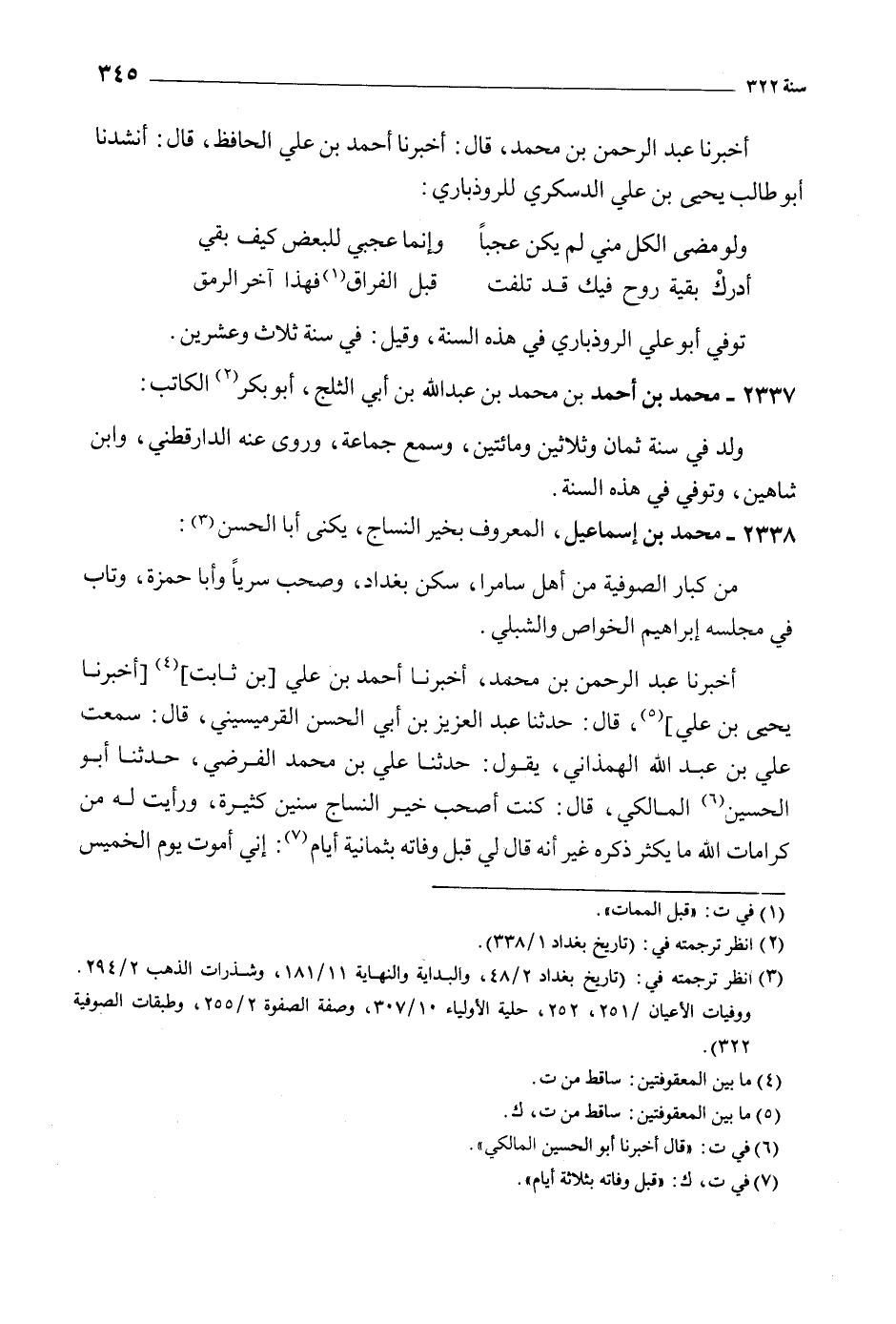 [3] انظر ترجمته في: (تاريخ بغداد 2/ 48، والبداية والنهاية 11/ 181، وشذرات الذهب 2/ 294.