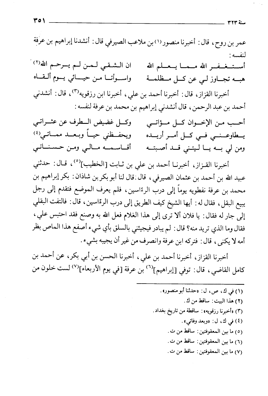 أَخْبَرَنَا الْقَزَّازُ، قَالَ: أَخْبَرَنَا أَحْمَد بْن عَلي، أَخْبَرَنَا ابن رزقويه [3] ، قَالَ: أنشدني أَحْمَد بْن عبد الرحمن، قَالَ أنشدني إبراهيم بْن مُحَمَّد بْن عرفة لنفسه: