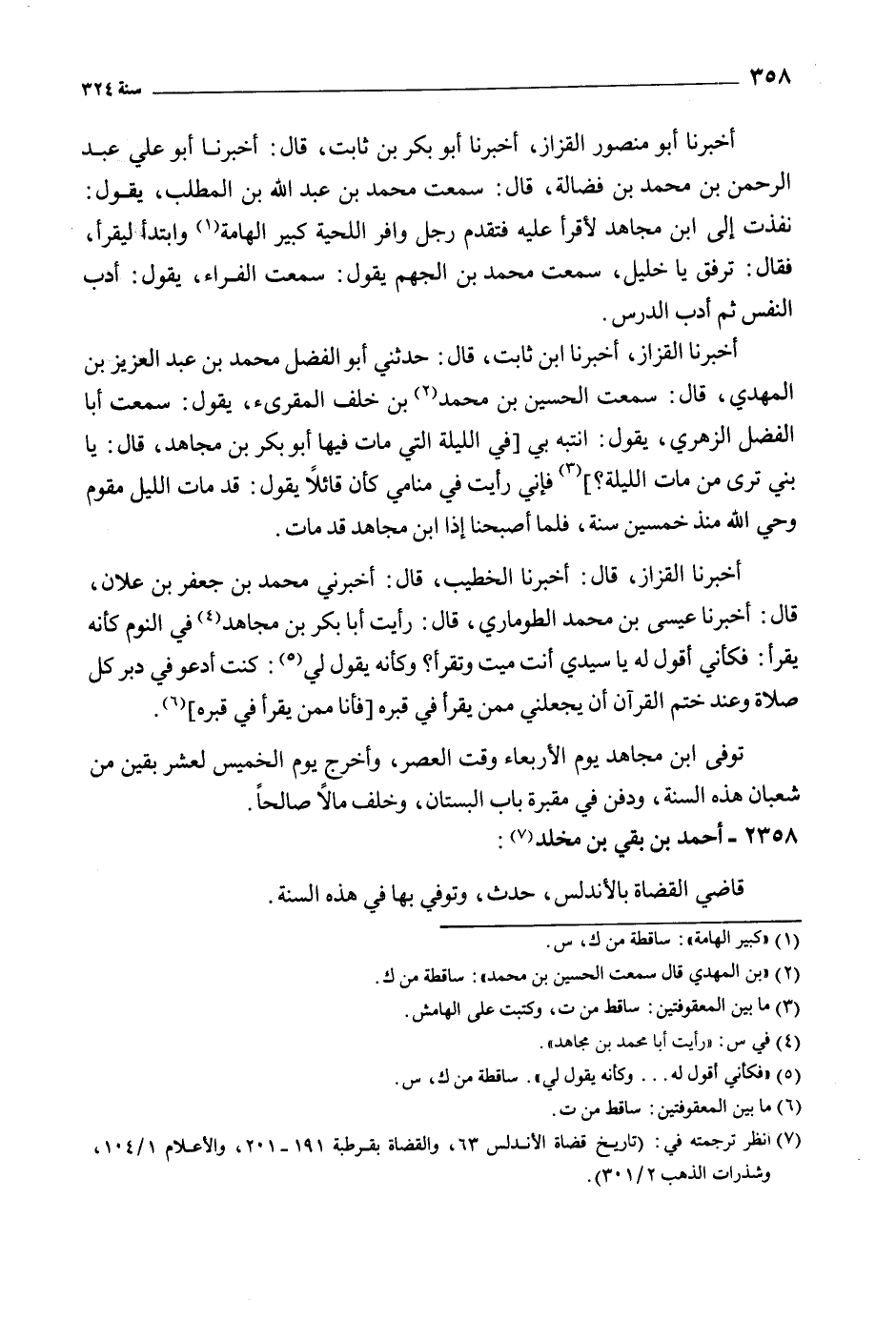 أخبرنا القزاز، أخبرنا ابن ثابت، قال: حدثني أَبُو الفضل مُحَمَّد بْن عبد العزيز بْن المهدي، قَالَ: سمعت الحسين بْن مُحَمَّد [2] بْن خلف المقرئ، يقول: سمعت أبا الفضل الزهري، يقول: انتبه بي [في الليلة التي مات فيها أَبُو بكر بْن مجاهد، قَالَ: يا بني ترى من مات الليلة؟] [3] فإني رأيت في منامي كَانَ قائلا يقول: قد مات الليل مقوم وحي الله منذ خمسين سنة، فلما أصبحنا إذا ابن مجاهد قد مات.
