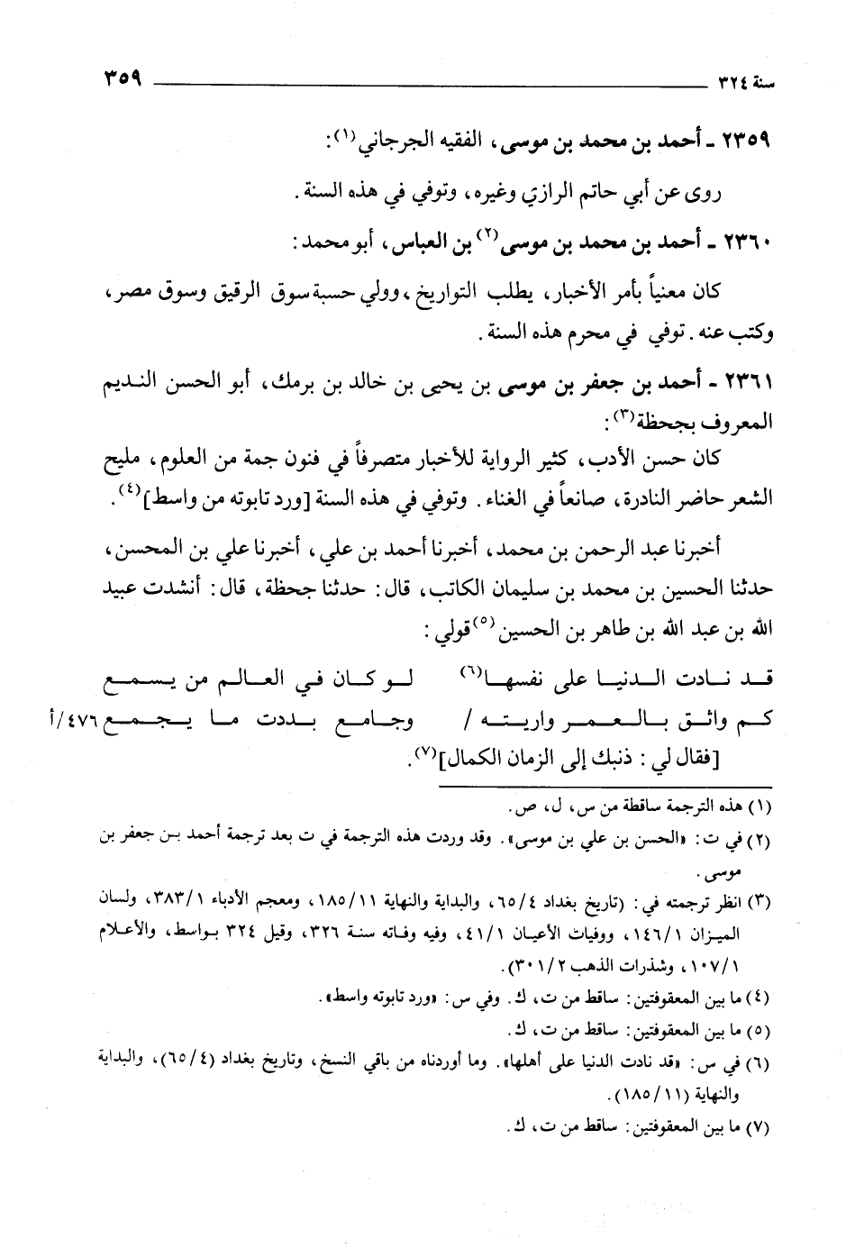 [3] انظر ترجمته في: (تاريخ بغداد 4/ 65، والبداية والنهاية 11/ 185، ومعجم الأدباء 1/ 383، ولسان الميزان 1/ 146، ووفيات الأعيان 1/ 41، وفيه وفاته سنة 326، وقيل 324 بواسط، والأعلام 1/ 107، وشذرات الذهب 2/ 301) .