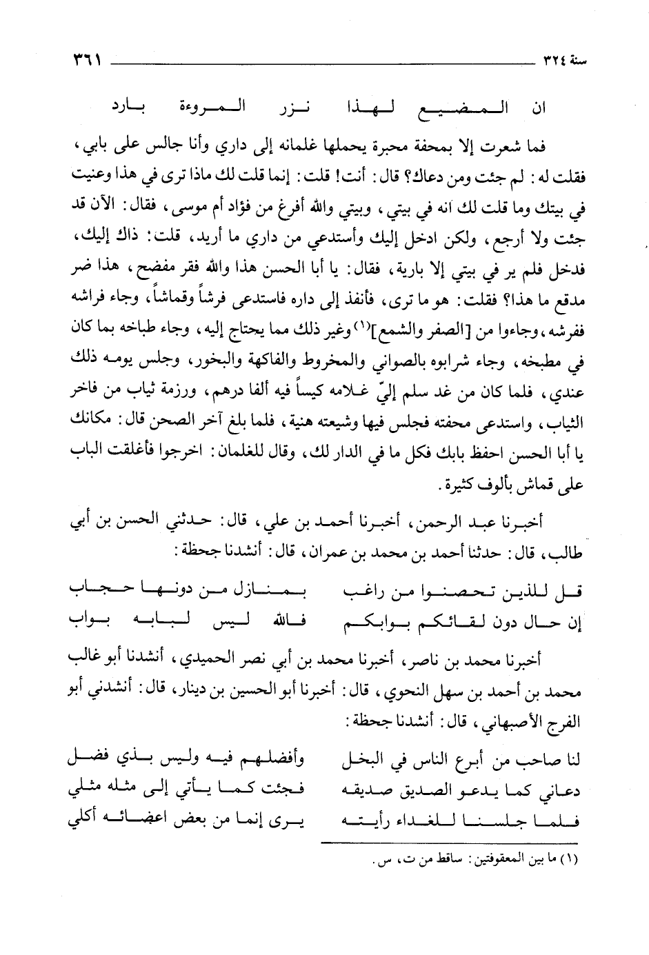 فما شعرت إلا بمحفة محبرة يحملها غلمانه إلى داري وأنا جالس على بابي، فقلت له: لم جئت ومن دعاك؟ قَالَ: أنت! قلت: إنما قلت لك ماذا ترى في هذا وعنيت في بيتك وما قلت لك أنه في بيتي، وبيتي والله أفرغ من فؤاد أم موسى، فَقَالَ: الآن قد جئت ولا أرجع، ولكن أدخل إليك وأستدعي من داري ما أريد، قلت: ذاك إليك، فدخل فلم ير في بيتي إلا بارية، فَقَالَ: يا أبا الحسن هذا والله فقر مفضح، هذا ضر مدقع ما هذا؟ فقلت: هو ما ترى، فأنفذ إلى داره فاستدعى فرشا وقماشا، وجاء فراشه ففرشه، وجاءوا من [الصفر والشمع] [1] وغير ذلك مما يحتاج إليه، وجاء طباخه بما كَانَ في مطبخه، وجاء شرابوه بالصواني والمخروط والفاكهة والبخور، وجلس يومه ذلك عندي، فلما كَانَ من غد سلم إلى غلامه كيسا فيه ألفا درهم، ورزمة ثياب من فاخر الثياب، واستدعى محفته فجلس فيها وشيعته هنية، فلما بلغ آخر الصحن قَالَ: مكانك يا أبا الحسن احفظ بابك فكل ما في الدار لك، وَقَالَ للغلمان: اخرجوا فأغلقت الباب على قماش بألوف كثيرة.
