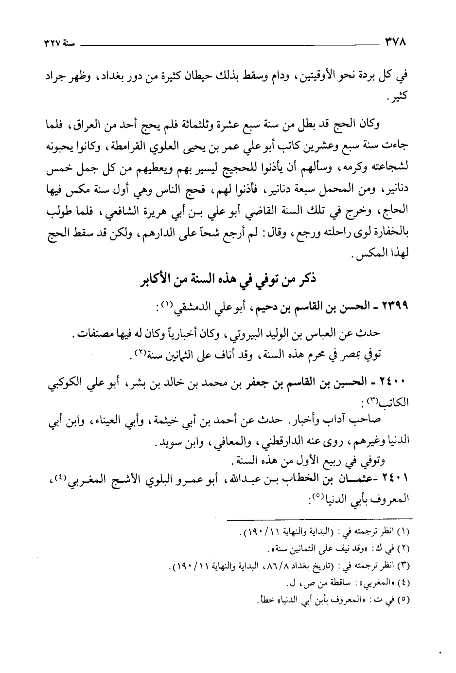 وَكَانَ الحج قد بطل من سنة سبع عشرة وثلاثمائة فلم يحج أحد من العراق، فلما جاءت سنة سبع وعشرين كاتب أَبُو عَلي عمر بْن يحيى العلوي القرامطة، وكانوا يحبونه لشجاعته وكرمه، وسألهم أن يأذنوا للحجيج ليسير بهم ويعطيهم من كل جمل خمس دنانير، ومن المحمل سبعة دنانير، فأذنوا لهم، فحج الناس وهي أول سنة مكس فيها الحاج، وخرج في تلك السنة القاضي أَبُو عَلي بْن أبي هريرة الشافعي، فلما طولب بالخفارة لوى راحلته ورجع، وَقَالَ: لم أرجع شحا على الدراهم، ولكن قد سقط الحج لهذا المكس.