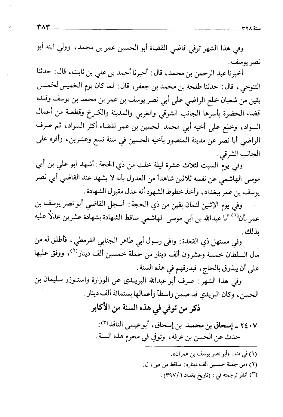 وفى هذا الشهر توفي قاضى القضاة أَبُو الحسين عمر بْن مُحَمَّد، وولى ابنه أَبُو نصر يُوسُف.