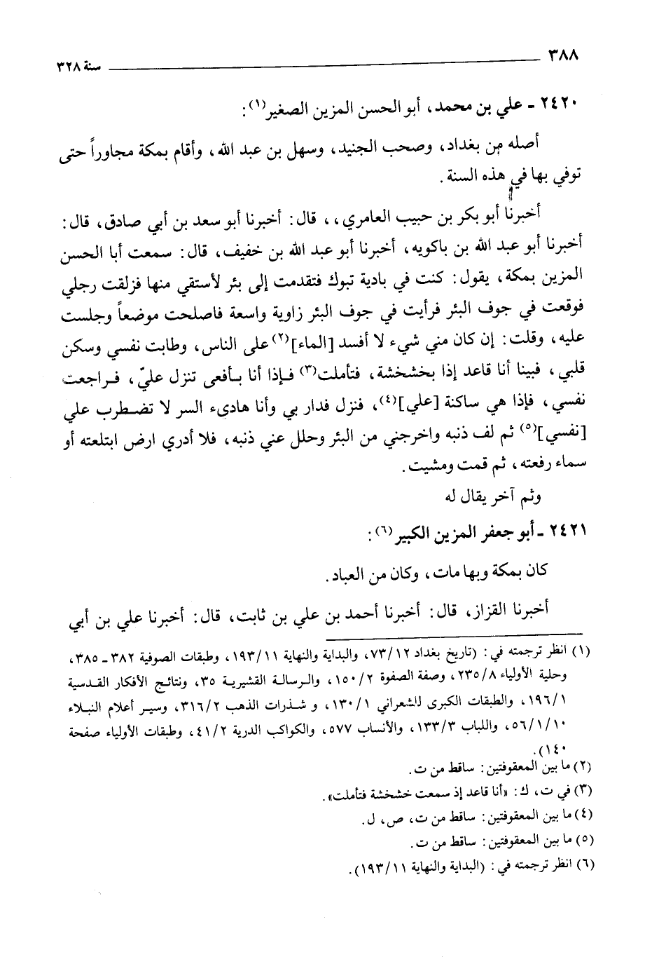 [1] انظر ترجمته في: (تاريخ بغداد 12/ 73، والبداية والنهاية 11/ 193، وطبقات الصوفية 382- 385، وحلية الأولياء 8/ 235، وصفة الصفوة 2/ 150، والرسالة القشيرية 35، ونتائج الأفكار القدسية 1/ 196، والطبقات الكبرى للشعراني 1/ 130، وشذرات الذهب 2/ 316، وسير أعلام النبلاء 10/ 1/ 56، واللباب 3/ 133، والأنساب 577، والكواكب الدرية 2/ 41، وطبقات الأولياء صفحة 140) .