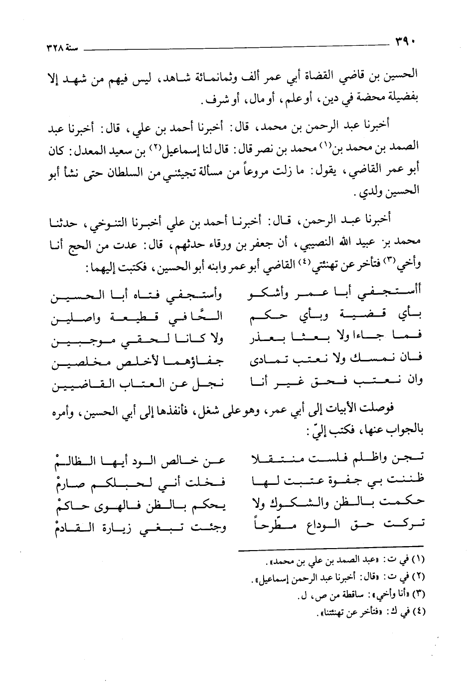 أَخْبَرَنَا عبد الرحمن، قال: أخبرنا أحمد بن علي أخبرنا التنوخي، حَدَّثَنَا مُحَمَّد بْن عُبَيْد اللَّهِ النصيبي، أن جعفر بْن ورقاء حدثهم، قَالَ: عدت من الحج أنا وأخي [3] فتأخر عن تهنئتي [4] القاضي أَبُو عمر وابنه أَبُو الحسين، فكتبت إليهما: