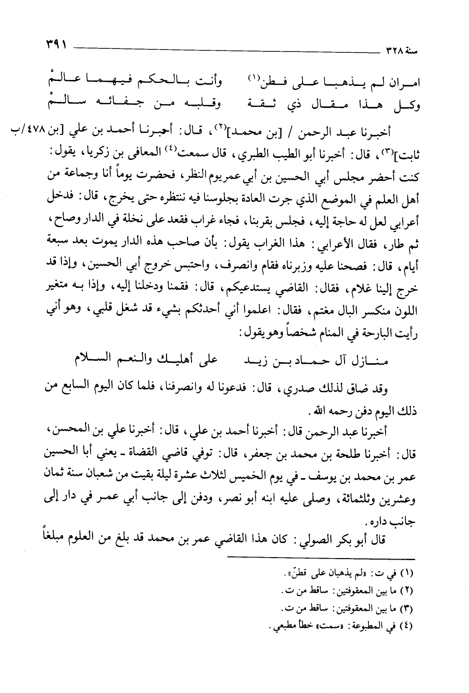 أخبرنا عبد الرحمن قال: أخبرنا أحمد بن عَلي، قَالَ: أَخْبَرَنَا عَلِيّ بْن المحسن، قَالَ: أَخْبَرَنَا طلحة بن محمد بن جعفر، قال: توفي قاضي القضاة- يعني أبا الحسين عمر بْن مُحَمَّد بْن يُوسُف- في يوم الخميس لثلاث عشرة ليلة بقيت من شعبان سنة ثمان وعشرين وثلاثمائة، وصلى عليه ابنه أَبُو نصر، ودفن إلى جانب أبي عمر في دار إلى جانب داره.