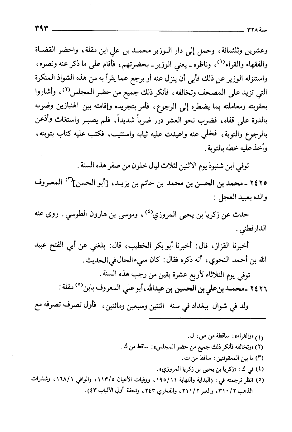 وعشرين وثلاثمائة، وحمل إلى دار الوزير مُحَمَّد بْن عَلي ابن مقلة، وأحضر القضاة والفقهاء والقراء [1] ، وناظره- يعنى الوزير- بحضرتهم، فأقام على ما ذكر عنه ونصره، واستنزله الوزير عن ذلك فأبى أن ينزل عنه أو يرجع عما يقرأ به من هذه الشواذ المنكرة التي تزيد على المصحف وتخالفه، فأنكر ذلك جميع من حضر المجلس [2] ، وأشاروا بعقوبته ومعاملته بما يضطره إلى الرجوع، فأمر بتجريده وإقامته بين الهنبازين وضربه بالدرة على قفاه، فضرب نحو العشر درر ضربا شديدا، فلم يصبر واستغاث وأذعن بالرجوع والتوبة، فخلى عنه وأعيدت عليه ثيابه واستتيب، فكتب عليه كتاب بتوبته، وأخذ عليه خطه بالتوبة.
