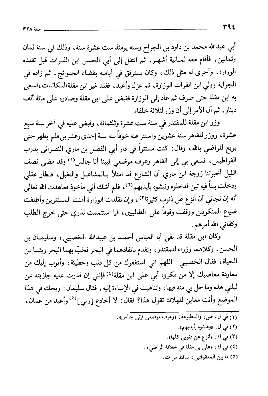 وَكَانَ ابن مقلة قد نفى أبا العباس أَحْمَد بْن عُبَيْد اللَّهِ الخصيبي، وسليمان بن الحسن، وكلاهما وزراء للمقتدر، وتقدم بإنفاذهما في البحر فخب بهما البحر ويئسا من الحياة، فَقَالَ الخصيبي: اللَّهمّ إنى أستغفرك من كل ذنب وخطيئة، وأتوب إليك من معاودة معاصيك إلا من مكروه أبي على ابن مقلة [4] فإنني إن قدرت عليه جازيته عن ليلتي هذه وما حل بي منه فيها، وتناهيت في الإساءة إليه، فَقَالَ سليمان: ويحك في هذا الموضع وأنت معاين للهلاك تقول هذا؟ فَقَالَ: لا أخادع [ربي] [5] وأعيد من عمان،