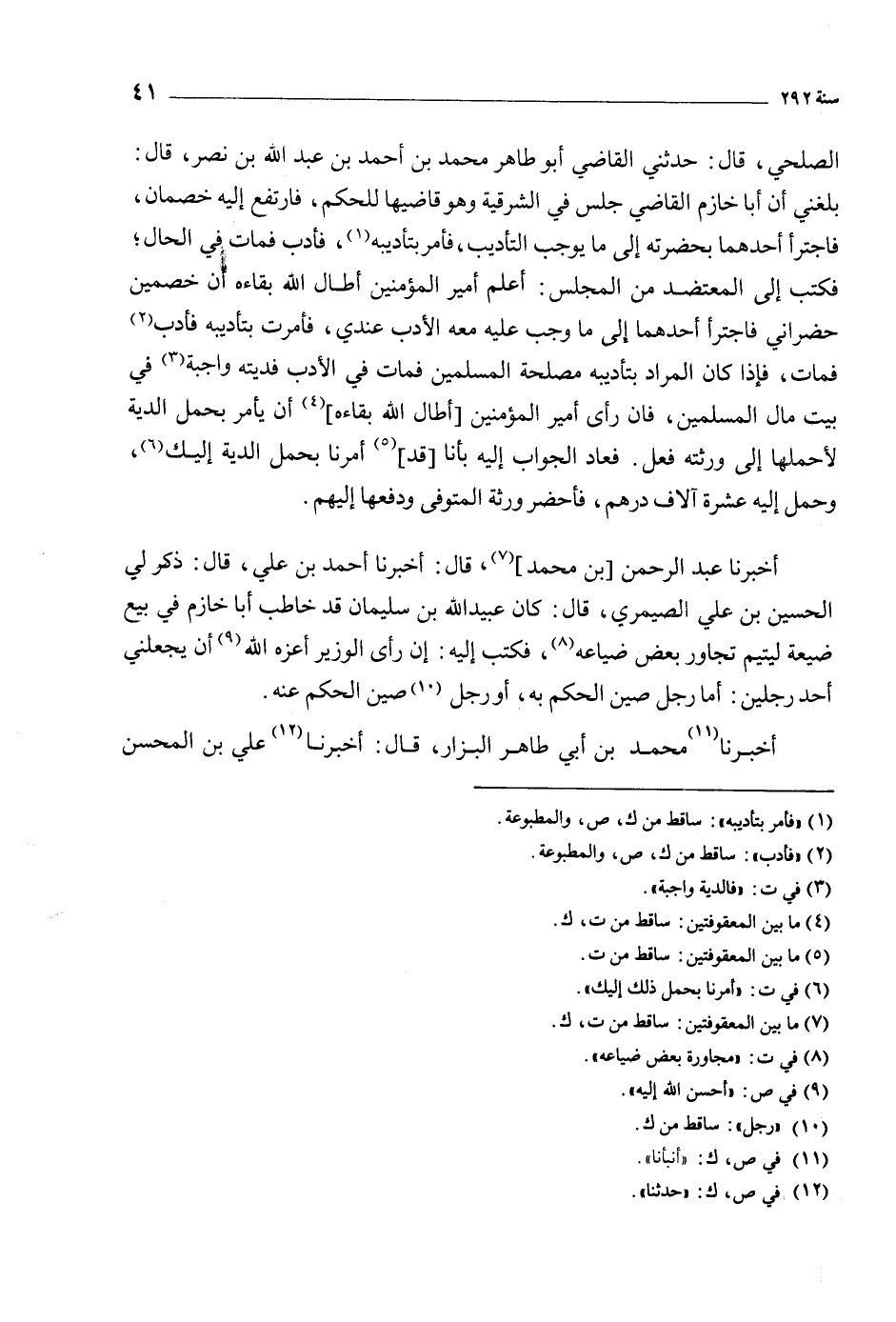 بلغني أن أبا خازم القاضي جلس في الشرقية وهو قاضيها للحكم، فارتفع إليه خصمان، فاجترأ أحدهما بحضرته إلى ما يوجب التأديب، فأمر بتأديبه [1] ، فأدب فمات في الحال، فكتب إلى المعتضد من المجلس: أعلم أمير المؤمنين أطال الله بقاءه أن خصمين حضراني فاجترأ أحدهما إلى ما وجب عليه معه الأدب عندي، فأمرت بتأديبه فأدب [2] فمات، فإذا كَانَ المراد بتأديبه مصلحة المسلمين فمات في الأدب فديته واجبة [3] في بيت مال المسلمين، فإن رأى أمير المؤمنين [أطال الله بقاءه] [4] أن يأمر بحمل الدية لأحملها إلى ورثته فعل. فعاد الجواب إليه بأنا [قد] [5] أمرنا بحمل الدية إليك [6] ، وحمل إليه عشرة آلاف درهم، فأحضر ورثة المتوفى ودفعها إليهم.