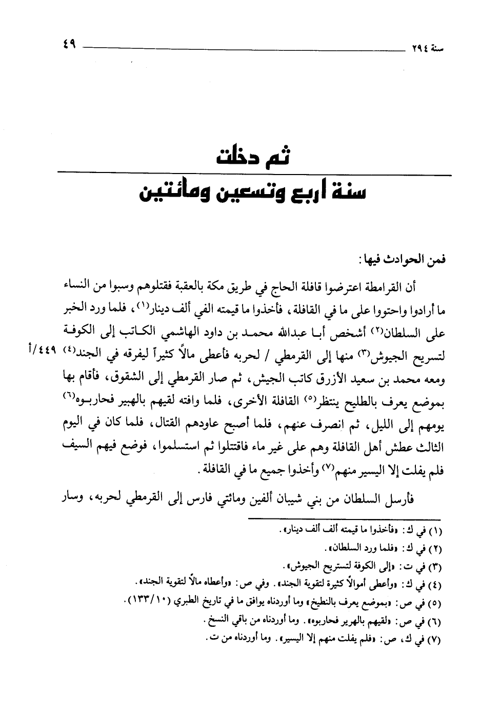 أن القرامطة اعترضوا قافلة الحاج في طريق مكة بالعقبة فقتلوهم وسبوا من النساء ما أرادوا واحتووا على ما في القافلة، فأخذوا ما قيمته ألفي ألف دينار [1] ، فلما ورد الخبر على السلطان [2] أشخص أبا عبد الله مُحَمَّد بْن داود الهاشمي الكاتب إلى الكوفة لتسريح الجيوش [3] منها إلى القرمطي/ لحربه فأعطي مالا كثيرا ليفرقه فِي الجند [4] ومعه مُحَمَّد بْن سعيد الأزرق كاتب الجيش، ثم صار القرمطي إلى الشقوق، فأقام بها بموضع يعرف بالطليح ينتظر [5] القافلة الأخرى، فلما وافته لقيهم بالهبير فحاربوه [6] يومهم إلى الليل، ثم انصرف عنهم، فلما أصبح عاودهم القتال، فلما كَانَ في اليوم الثالث عطش أهل القافلة وهم على غير ماء فاقتتلوا ثم استسلموا، فوضع فيهم السيف فلم يفلت إلا اليسير منهم [7] وأخذوا جميع ما في القافلة.