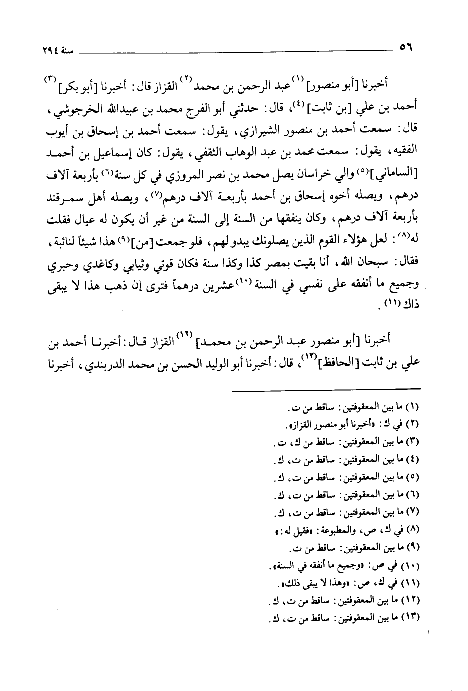 أخبرنا [أبو منصور] [1] عبد الرحمن بن محمد [2] الْقَزَّازُ قَالَ: أَخْبَرَنَا [أَبُو بَكْرٍ] [3] أَحْمَدُ بْنُ عَلي [بْن ثَابِت] [4] ، قَالَ: حدثني أَبُو الفرج مُحَمَّد بْن عُبَيْد اللَّهِ الخرجوشي، قَالَ: سمعت أَحْمَد بْن منصور الشيرازي، يقول: سمعت أَحْمَد بْن إسحاق بْن أيوب الفقيه، يقول: سمعت مُحَمَّد بْن عبد الوهاب الثقفي، يقول: كَانَ إسماعيل بْن أَحْمَد [الساماني] [5] والي خراسان يصل مُحَمَّد بْن نصر المروزي في كل سنة [6] بأربعة آلاف درهم، ويصله أخوه إسحاق بْن أَحْمَد بأربعة آلاف درهم [7] ، ويصله أهل سمرقند بأربعة آلاف درهم، وَكَانَ ينفقها من السنة إلى السنة من غير أن يكون له عيال فقلت له [8] : لعل هؤلاء القوم الذين يصلونك يبدو لهم، فلو جمعت [من] [9] هذا شيئا لنائبة، فَقَالَ: سبحان الله، أنا بقيت بمصر كذا وكذا سنة فكان قوتي وثيابي وكاغدي وحبري وجميع ما أنفقه على نفسي في السنة [10] عشرين درهما فترى إن ذهب هذا لا يبقى ذاك [11] .