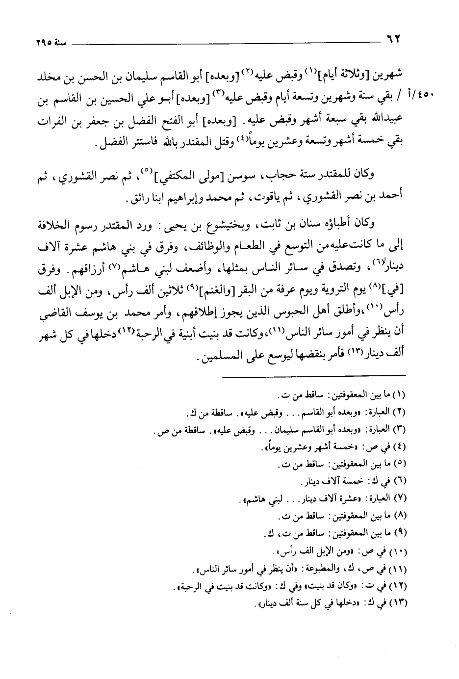 وَكَانَ أطباؤه سنان بْن ثَابِت، وبختيشوع بْن يحيى: ورد المقتدر رسوم الخلافة إلى ما كانت عليه من التوسع في الطعام والوظائف، وفرق في بني هاشم عشرة آلاف دينارا [6] ، وتصدق في سائر الناس بمثلها، وأضعف لبني هاشم [7] أرزاقهم. وفرق [في] [8] يوم التروية ويوم عرفة من البقر [والغنم] [9] ثلاثين ألف رأس، ومن الإبل ألف رأس [10] ، وأطلق أهل الحبوس الذين يجوز إطلاقهم، وأمر مُحَمَّد بْن يُوسُف القاضي أن ينظر في أمور سائر الناس [11] ، وكانت قد بنيت أبنية في الرحبة [12] دخلها في كل شهر ألف دينار [13] فأمر بنقضها ليوسع على المسلمين.