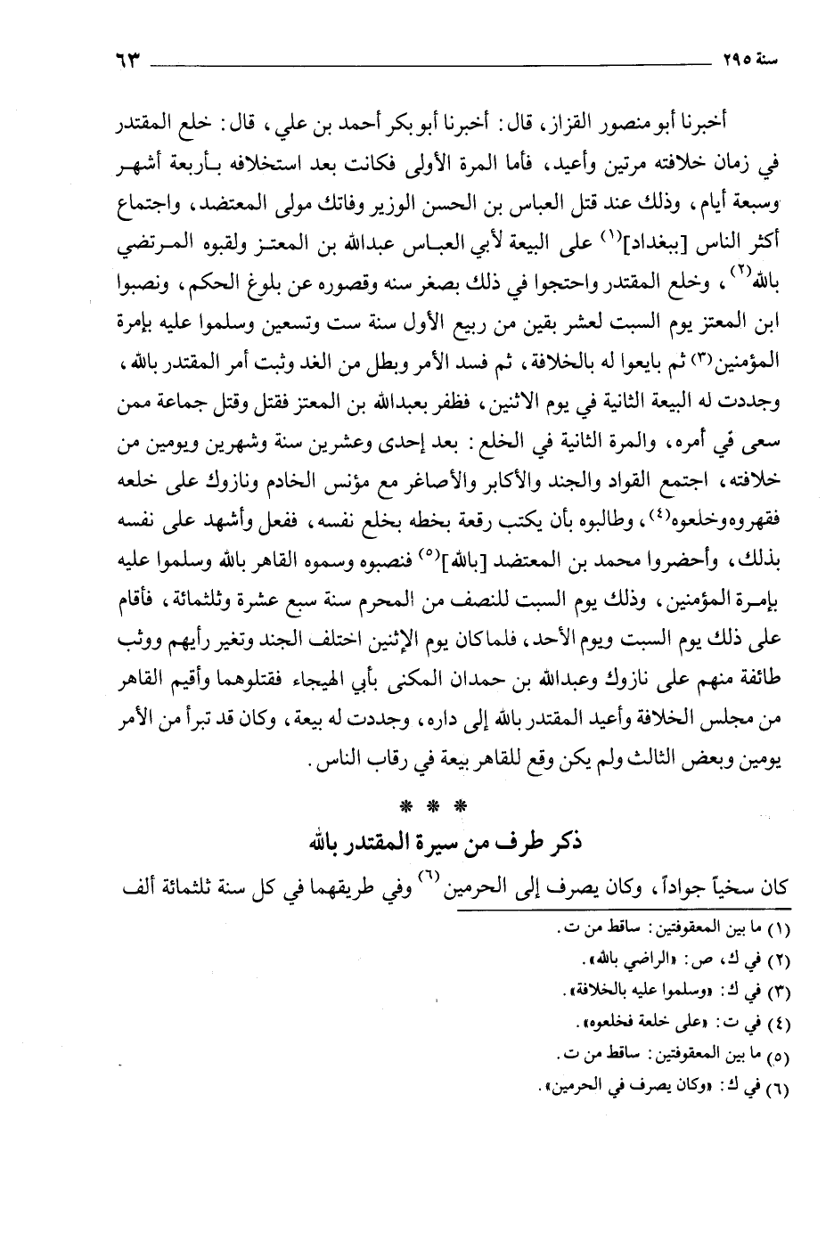 أخبرنا أبو منصور القزاز، قال: أخبرنا أبو بكر أَحْمَد بْن عَلي، قَالَ: خلع المقتدر في زمان خلافته مرتين وأعيد، فأما المرة الأولى فكانت بعد استخلافه بأربعة أشهر وسبعة أيام، وذلك عند قتل العباس بْن الحسن الوزير وفاتك مولى المعتضد، واجتماع أكثر الناس [ببغداد] [1] على البيعة لأبي العباس عبد الله بْن المعتز ولقبوه المرتضي باللَّه [2] ، وخلع المقتدر واحتجوا في ذلك بصغر سنة وقصوره عن بلوغ الحكم، ونصبوا ابن المعتز يوم السبت لعشر بقين من ربيع الأول سنة ست وتسعين وسلموا عليه بإمرة المؤمنين [3] ثم بايعوا له بالخلافة، ثم فسد الأمر وبطل من الغد وثبت أمر المقتدر باللَّه، وجددت له البيعة الثانية في يوم الاثنين، فظفر بعبد الله بْن المعتز فقتل وقتل جماعة ممن سعى في أمره، والمرة الثانية في الخلع: بعد إحدى وعشرين سنة وشهرين ويومين من خلافته، اجتمع القواد والجند والأكابر والأصاغر مع مؤنس الخادم ونازوك على خلعه فقهروه وخلعوه [4] ، وطالبوه بأن يكتب رقعة بخطه بخلع نفسه، ففعل وأشهد على نفسه بذلك، وأحضروا مُحَمَّد بْن المعتضد [باللَّه] [5] فنصبوه وسموه القاهر باللَّه وسلموا عليه بإمرة المؤمنين، وذلك يوم السبت للنصف من المحرم سنة سبع عشرة وثلاثمائة، فأقام على ذلك يوم السبت ويوم الأحد، فلما كَانَ يوم الاثنين اختلف الجند وتغير رأيهم ووثب طائفة منهم على نازوك وعبد الله بْن حمدان المكنى بأبي الهيجاء فقتلوهما وأقيم القاهر من مجلس الخلافة وأعيد المقتدر باللَّه إلى داره، وجددت له بيعة، وَكَانَ قد تبرأ من الأمر يومين وبعض الثالث ولم يكن وقع للقاهر بيعة في رقاب الناس.