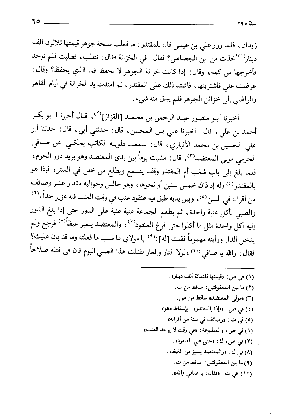 أَخْبَرَنَا أَبُو منصور عبد الرحمن بْن مُحَمَّد [الْقَزَّازُ] [2] ، قَالَ أَخْبَرَنَا أَبُو بَكْرٍ أَحْمَدُ بْنُ علي، قال: أخبرنا علي بن المحسن، قال: حدثني أبي، قَالَ: حَدَّثَنَا أَبُو عَلي الحسين بْن مُحَمَّد الأنباري، قَالَ: سمعت دلويه الكاتب يحكى عن صافى الحرمي مولى المعتضد [3] ، قَالَ: مشيت يوما بين يدي المعتضد وهو يريد دور الحرم، فلما بلغ إلى باب شغب أم المقتدر وقف يتسمع ويطلع من خلل في الستر، فإذا هو بالمقتدر [4] وله إذ ذاك خمس سنين أو نحوها، وهو جالس وحواليه مقدار عشر وصائف من أقرانه في السن [5] ، وبين يديه طبق فيه عنقود عنب في وقت العنب فِيهِ عزيز جدا، [6] والصبي يأكل عنبة واحدة، ثم يطعم الجماعة عنبة عنبة على الدور حتى إذا بلغ الدور إليه أكل واحدة مثل ما أكلوا حتى فرغ العنقود [7] ، والمعتضد يتميز غيظا [8] فرجع ولم يدخل الدار ورأيته مهموما فقلت [له] : [9] يا مولاي ما سبب ما فعلته وما قد بان عليك؟