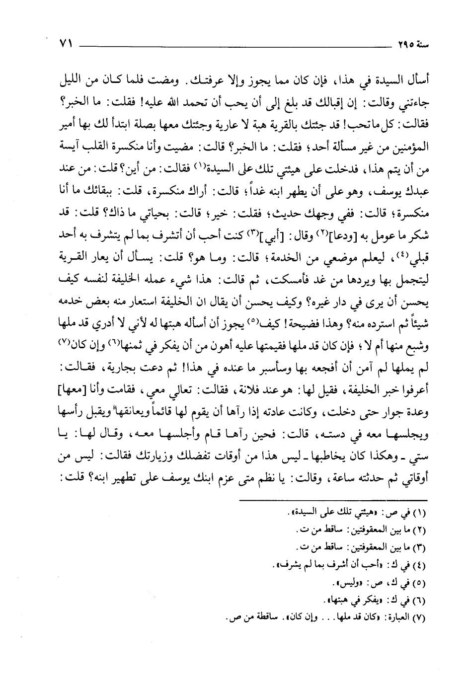 فقالت: كل ما تحب! قد جئتك بالقرية هبة لا عارية وجئتك معها بصلة ابتدأ لك بها أمير المؤمنين من غير مسألة أحد، فقلت: ما الخبر؟ قالت: مضيت وأنا منكسرة القلب آيسة من أن يتم هذا، فدخلت على هيئتي تلك على السيدة [1] فقالت: من أين؟ قلت: من عند عبدك يُوسُف، وهو على أن يطهر ابنه غدا، قالت: أراك منكسرة، قلت: ببقائك ما أنا منكسرة، قالت: ففي وجهك حديث، فقلت: خير، قالت: بحياتي ما ذاك؟ قلت: قد شكر ما عومل به [ودعا] [2] وقال: [أبي] [3] كنت أحب أن أتشرف بما لم يتشرف به أحد قبلي [4] ، ليعلم موضعي من الخدمة، قالت: وما هو؟ قلت: يسأل إن يعار القرية ليتجمل بها ويردها من غد فأمسكت، ثم قالت: هذا شيء عمله الخليفة لنفسه كيف يحسن أن يرى في دار غيره؟ وكيف يحسن أن يقال إن الخليفة استعار منه بعض خدمه شيئا ثم استرده منه؟ وهذا فضيحة! كيف [5] يجوز أن أسأله هبتها له لأني لا أدري قد ملها وشبع منها أم لا، فإن كَانَ قد ملها فقيمتها عليه أهون من أن يفكر في ثمنها [6] وإن كَانَ [7] لم يملها لم آمن أن أفجعه بها وسأسبر ما عنده في هذا! ثم دعت بجارية، فقالت: