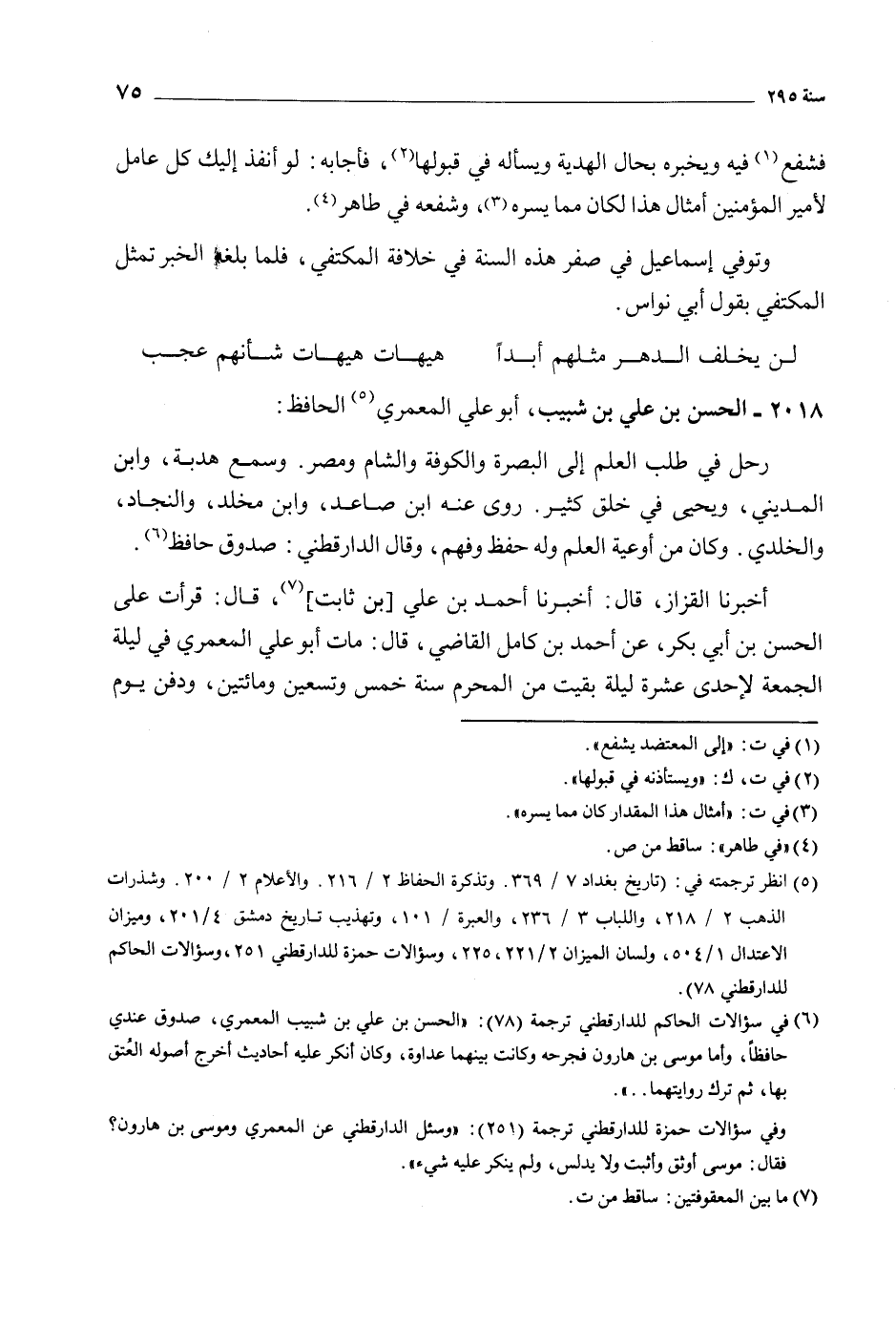 [6] في سؤالات الحاكم للدارقطنيّ ترجمة (78) : «الحسن بن علي بن شبيب المعمري، صدوق عندي حافظا، وأما موسى بن هارون فجرحه وكانت بينهما عداوة، وكان أنكر عليه أحاديث أخرج أصوله العتق بها، ثم ترك روايتهما ... » .
