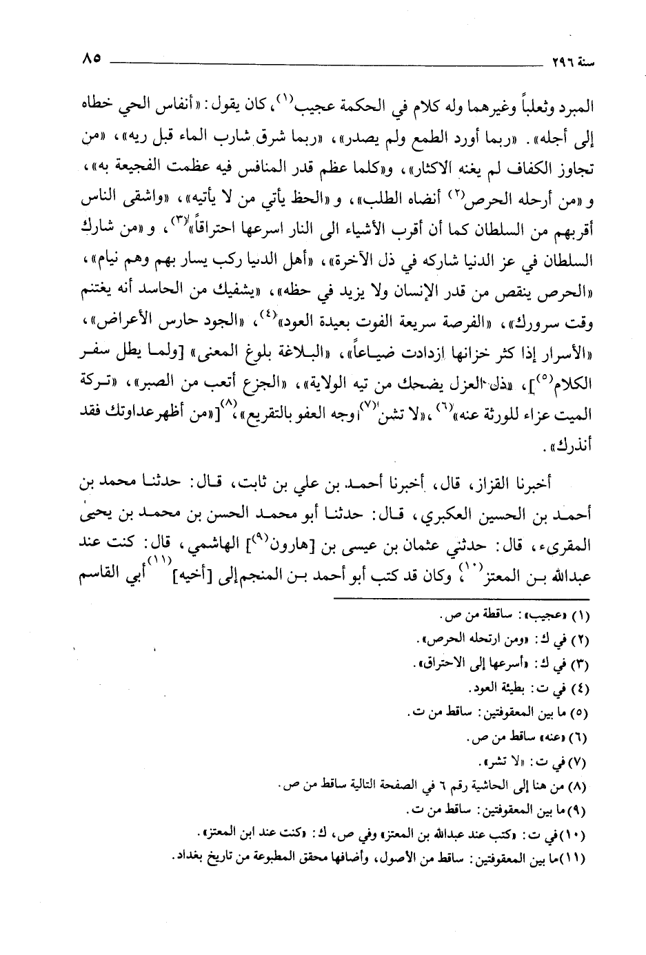 [10] في ت: «كتب عند عبد الله بن المعتز» وفي ص، ك: «كنت عند ابن المعتز» .
