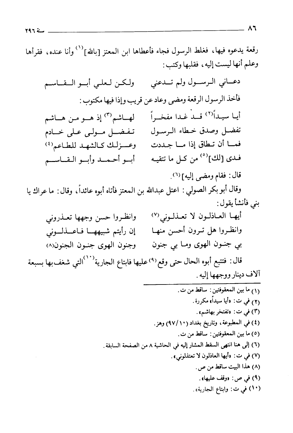 رقعة يدعوه فيها، فغلط الرسول فجاء فأعطاها ابن المعتز [باللَّه] [1] وأنا عنده، فقرأها وعلم أنها ليست إليه، فقلبها وكتب: