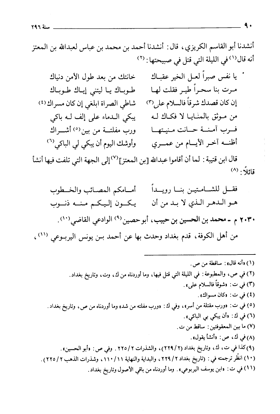 أنشدنا أَبُو الْقَاسِم الكريزي، قَالَ: أنشدنا أَحْمَد بْن مُحَمَّد بْن عباس لعبد الله بْن المعتز أنه قَالَ [1] في الليلة التي قتل فِي صبيحتها: [2]
