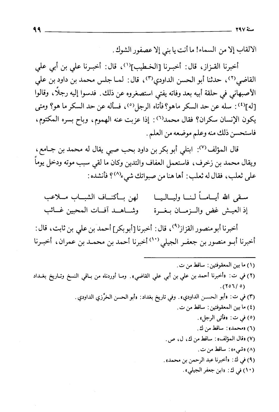 قَالَ المؤلف [7] : ابتلي أَبُو بكر بْن داود بحب صبي يقال له مُحَمَّد بْن جامع، ويقال مُحَمَّد بْن زخرف، فاستعمل العفاف والتدين وَكَانَ ما لقي سبب موته ودخل يوما على ثعلب، فَقَالَ له ثعلب: أهاهنا من صبواتك شيء [8] ؟ فأنشده:
