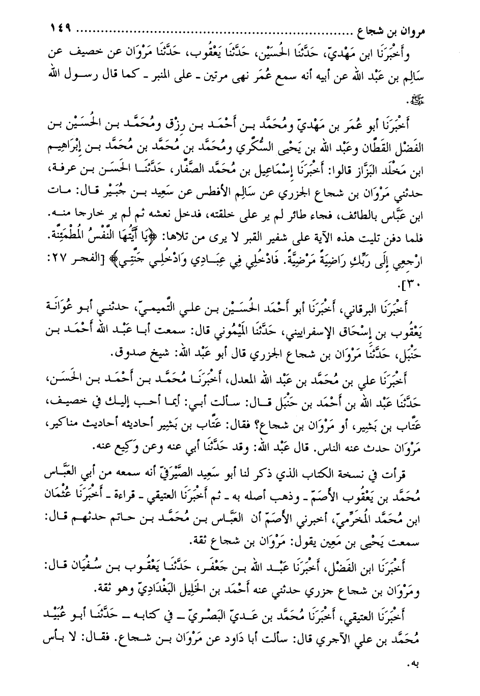 قرأت في نسخة الكتاب الذي ذكر لنا أَبُو سَعِيد الصيرفي أَنَّهُ سمعه من أبي العباس مُحَمَّد بن يعقوب الأصم- وذهب أصله به- ثم أخبرنا العتيقي- قراءة- أخبرنا عثمان ابن محمّد المخرّميّ، أَخْبَرَنِي الأصم أنّ الْعَبَّاس بْن مُحَمَّد بْن حاتم حدثهم قال:
