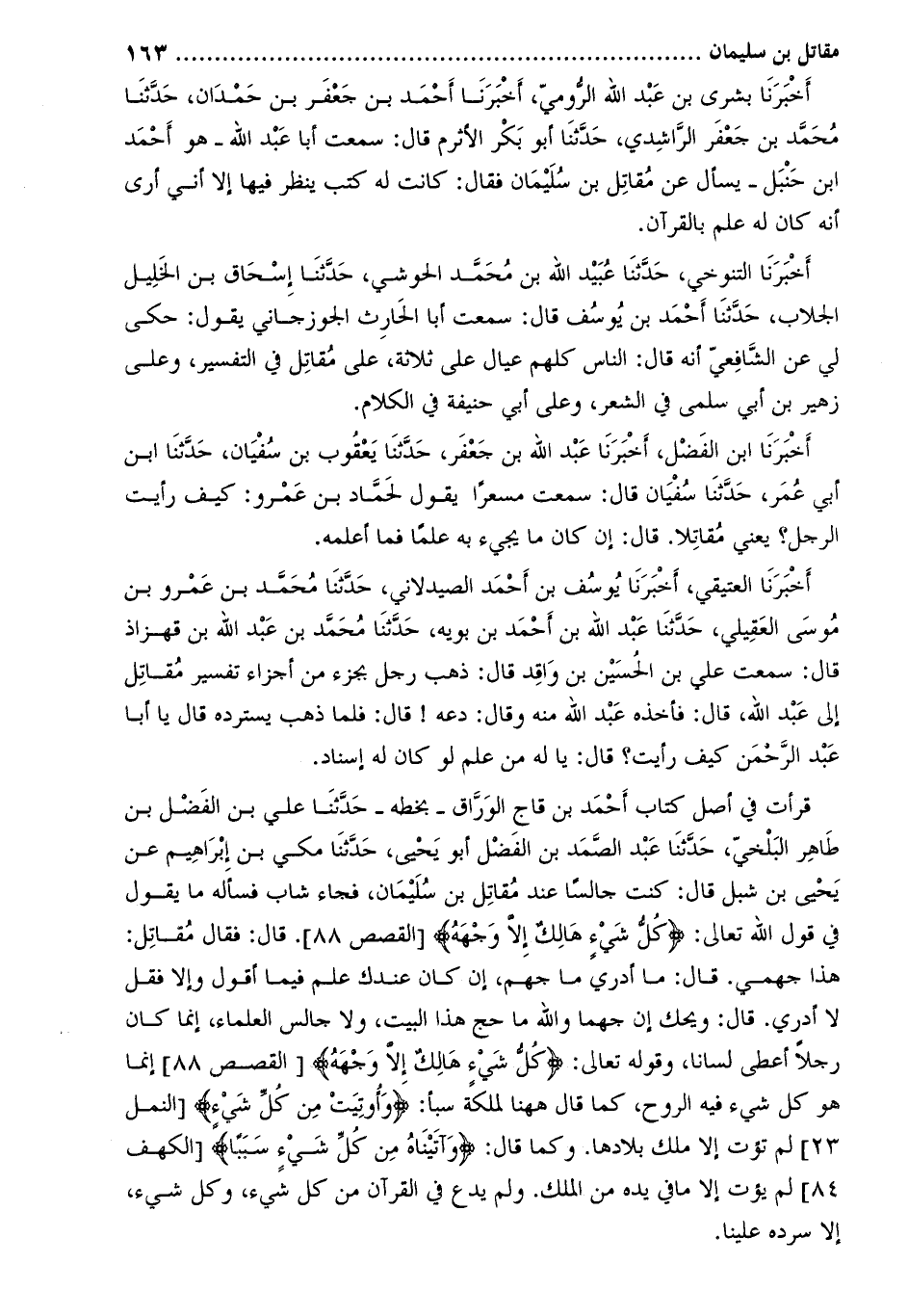 قرأت في أصل كتاب أَحْمَد بْن قاج الوراق- بخطه- حَدَّثَنَا عَلِيُّ بْنُ الْفَضْلِ بْنِ طَاهِرٍ الْبَلْخِيُّ، حَدَّثَنَا عبد الصمد بن الفضل أَبُو يحيى، حَدَّثَنَا مكي بن إبراهيم عن يحيى بن شبل قَالَ: كنت جالسا عند مقاتل بن سليمان، فجاء شاب فسأله ما يقول في قول الله تعالى: كُلُّ شَيْءٍ هالِكٌ إِلَّا وَجْهَهُ