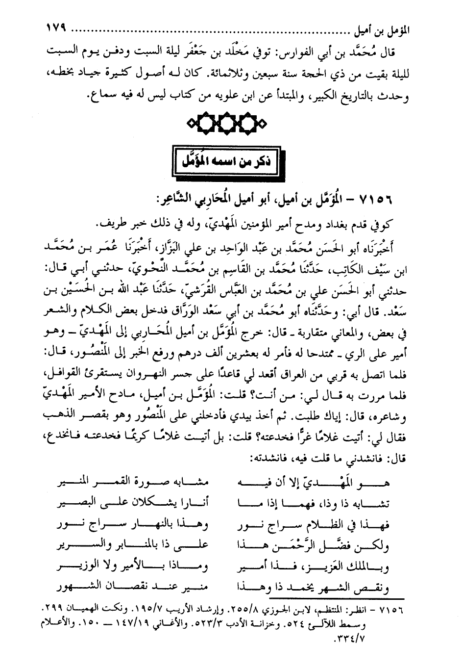 حَدَّثَنِي أَبُو الحسن علي بْن مُحَمَّد بن العبّاس القرشيّ، حَدَّثَنَا عبد الله بن الحسين بن سعد. قَالَ أبي: وحَدَّثَنَاه أَبُو مُحَمَّد بن أبي سعد الوراق فدخل بعض الكلام والشعر في بعض، والمعاني متقاربة- قَالَ: خرج المؤمل بن أميل المحاربي إلى المهدي- وهو أمير على الري- ممتدحا له فأمر له بعشرين ألف درهم ورفع الخبر إلى المنصور، قَالَ: