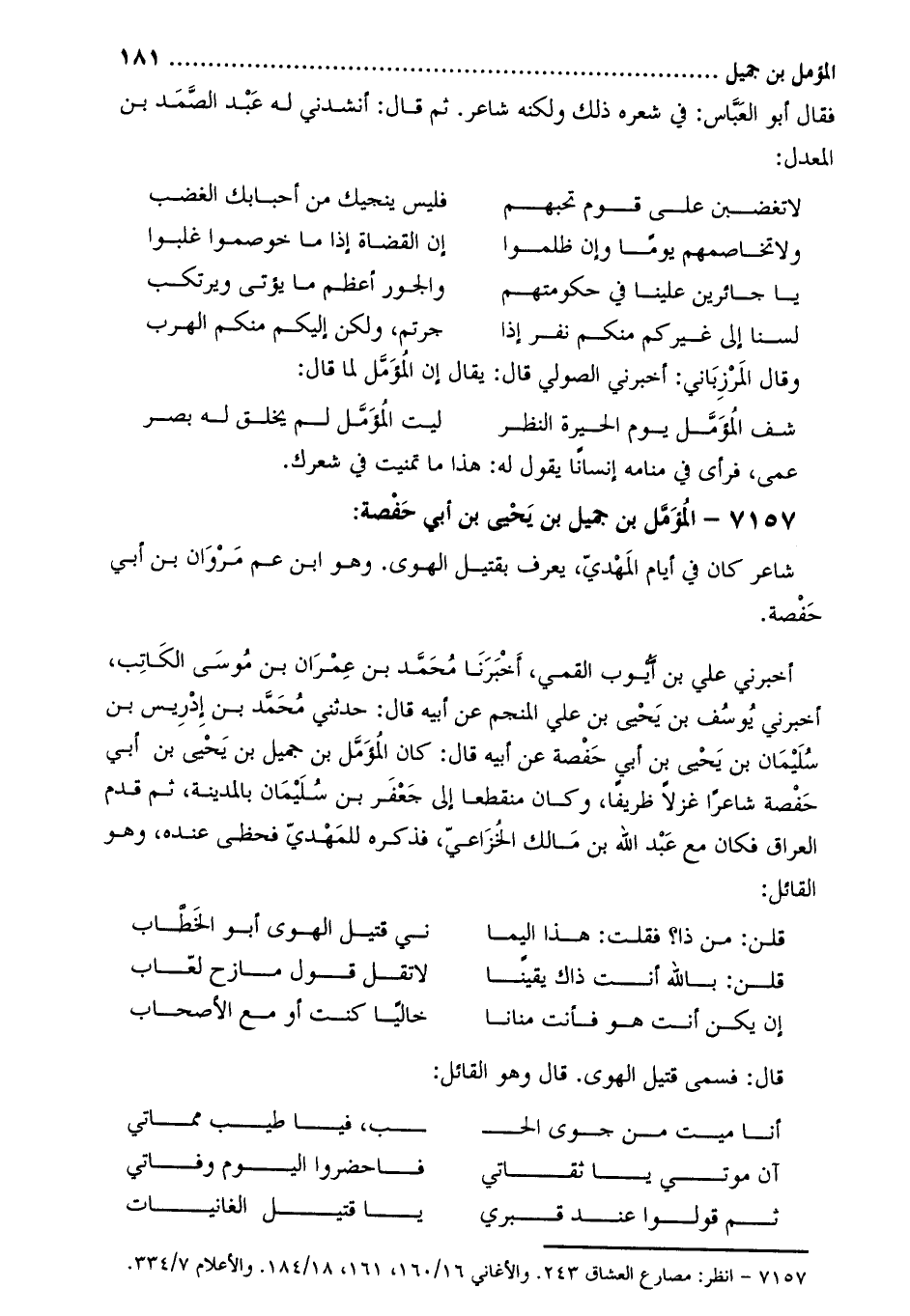 [1] 7157- انظر: مصارع العشاق 243. والأغاني 16/160، 161، 18/184. والأعلام 7/334.