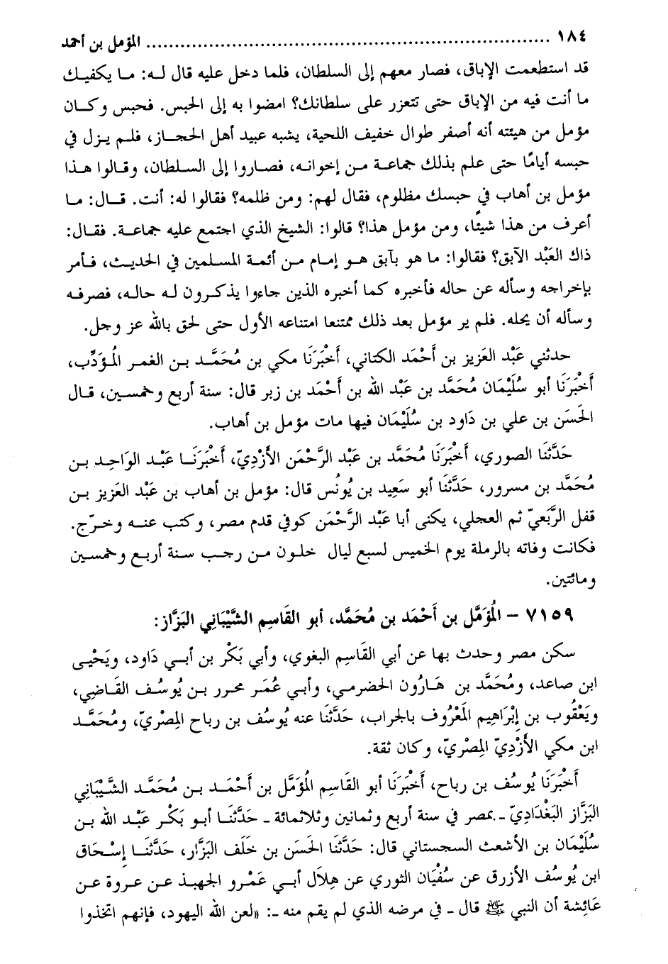 7159- المؤمل بن أَحْمَد بن مُحَمَّد، أَبُو القاسم الشيباني البزاز: