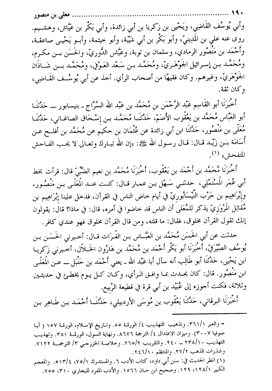 حدثت عن أبي الحسن محمد بن العباس بن الفرات قَالَ: أَخْبَرَنِي الحسن بن يوسف الصيرفي، أَخْبَرَنَا أَبُو بَكْرٍ أَحْمَدُ بْنُ مُحَمَّدِ بْنِ هارون الخلّال، أخبرني زكريا ابن يحيى، حَدَّثَنَا أَبُو طالب أنه سأل أبا عَبْد اللَّهِ- يَعْنِي أَحْمَد بْن حنبل- عن المعلى ابن منصور. قَالَ: كان يحدث بما وافق الرأي، وكان كل يوم يخطئ في حديثين وثلاثة، فكنت أجوزه إلى عبيد بن أبي قرة في قطيعة الرّبيع.