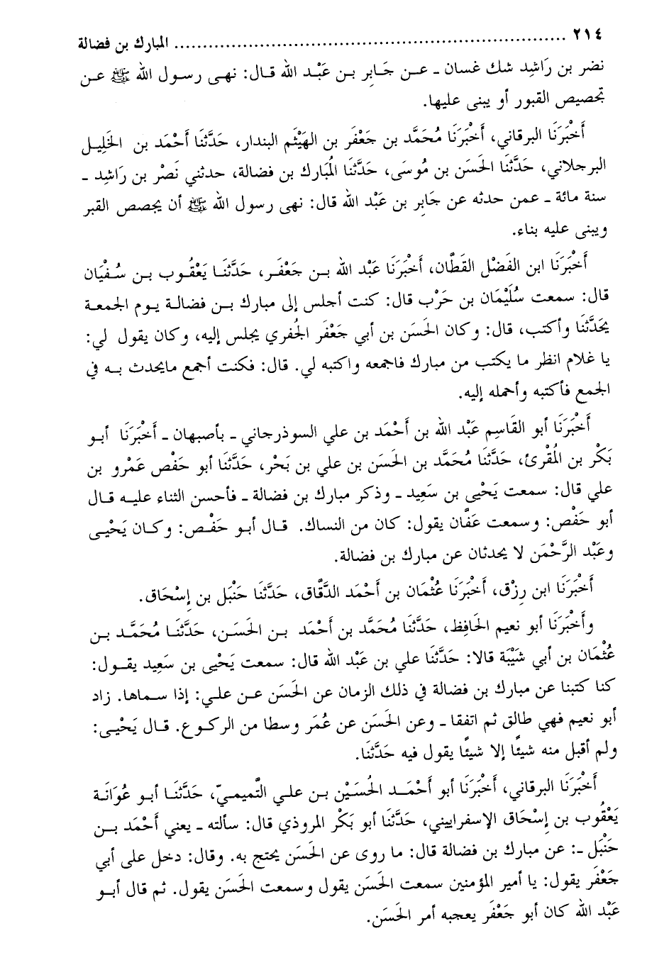 أخبرنا البرقاني، أَخْبَرَنَا مُحَمَّدُ بْنُ جَعْفَرِ بْنِ الْهَيْثَمِ الْبُنْدَارُ، حدّثنا أحمد بن الخليل البرجلاني، حدّثنا الحسن بن موسى، حدّثنا المبارك بن فضالة، حَدَّثَنِي نَصْرُ بْنُ رَاشِدٍ- سَنَةَ مِائَةٍ- عَمَّنْ حَدَّثَهُ عَنْ جَابِرِ بْنِ عَبْدِ اللَّهِ قَالَ: نَهَى رَسُولُ اللَّهِ صَلَّى اللَّهُ عَلَيْهِ وَسَلَّمَ أَنْ يُجَصَّصَ الْقَبْرُ وَيُبْنَى عَلَيْهِ بِنَاءٌ.