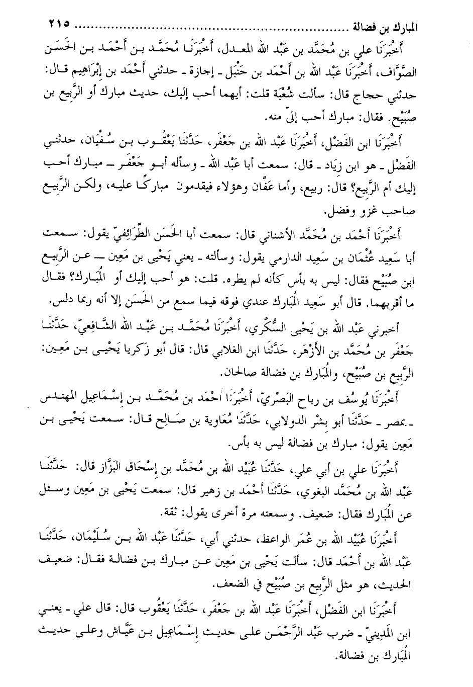 أَخْبَرَنَا عبيد الله بن عمر الواعظ، حَدَّثَني أبي، حدثنا عبد اللَّه بْن سليمان، حَدَّثَنَا عبد الله بن أحمد قَالَ: سألت يحيى بن معين عن مبارك بن فضالة فقال: ضعيف الحديث، هو مثل الربيع بن صبيح في الضعف.